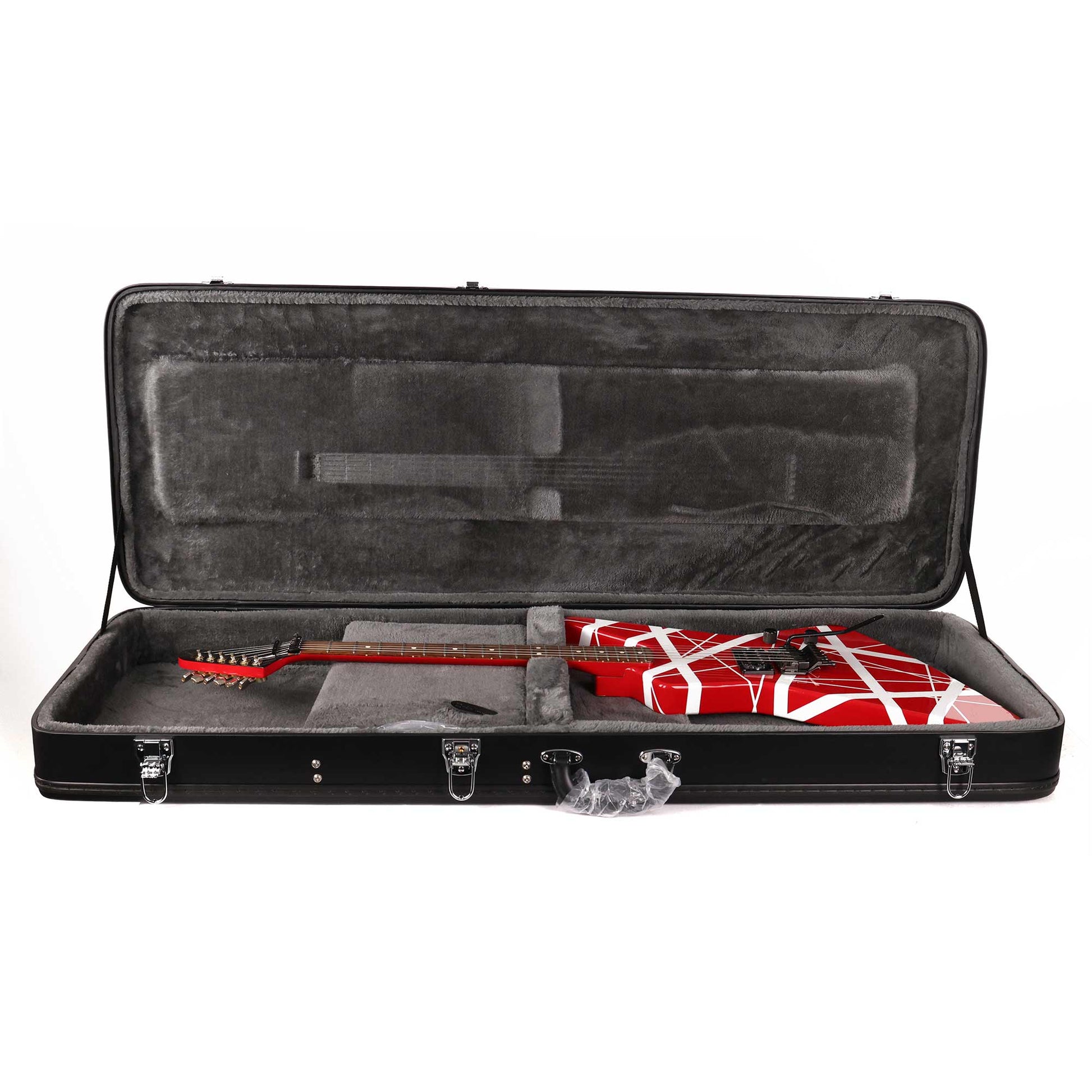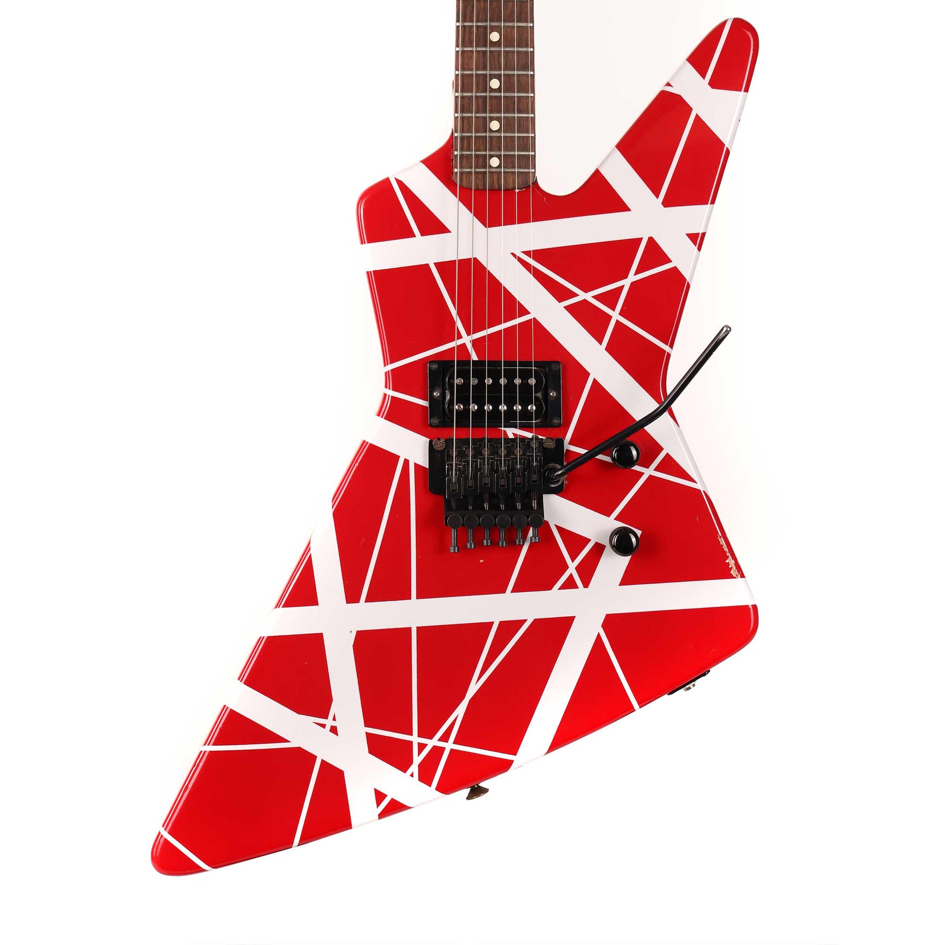 Blink fast and you might miss it, this is something you're likely to never see again. A 1980 Charvel 'Pre-Production' guitar with a famous body shape and an even more famous paint job! The guitar features red and white stripes throughout the body with a solid red painted neck. The original brass tremolo bridge has been changed to a top-mounted Floyd Rose tremolo, and the original piece of hardware is included with the guitar. There is a Seymour Duncan '59 humbucker in the guitar, it looks like an older pickup that has been in there for a while and is stickered as a '59BJ' pickup. This guitar is as rare as it gets, and is a no-brainer for vintage Charvel collectors. It comes with a modern Epiphone hardshell case designed to fit this body shape. You can even see a picture of the original owner with the guitar and the original brass bridge from a photo scanned in our photo gallery!