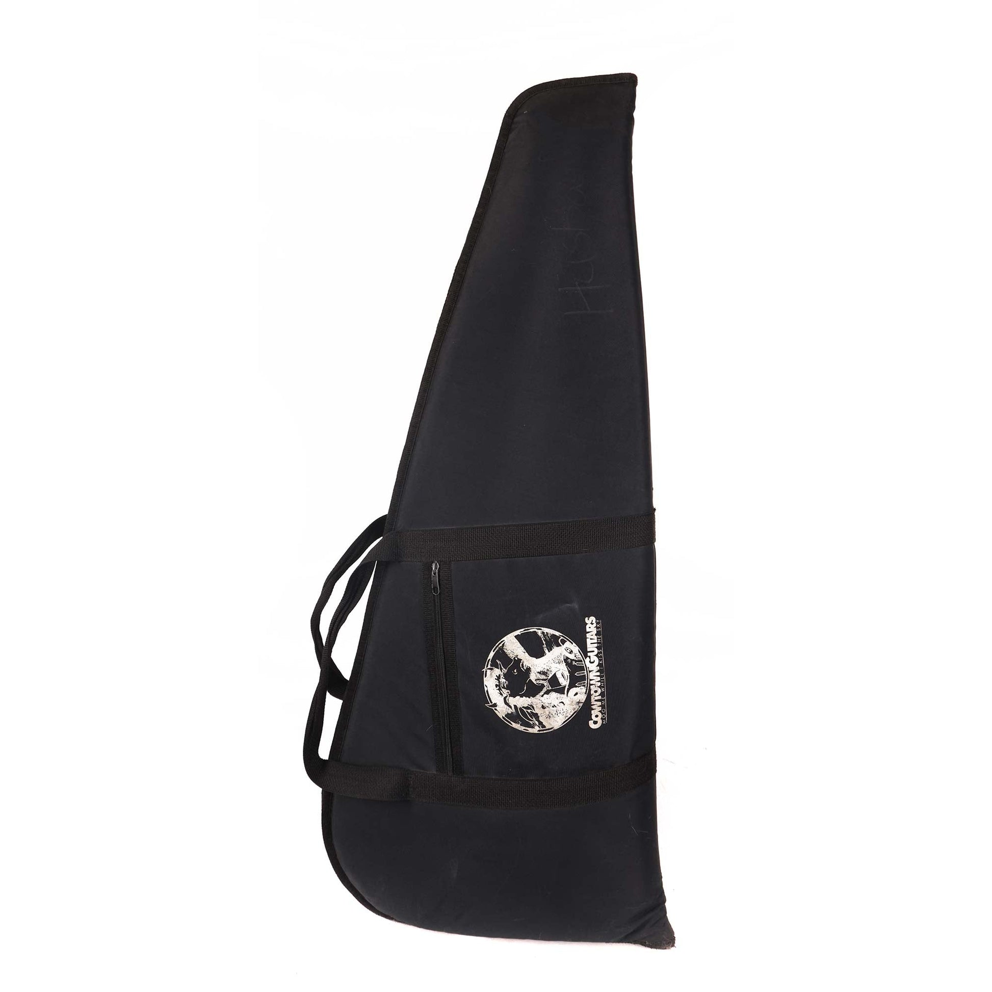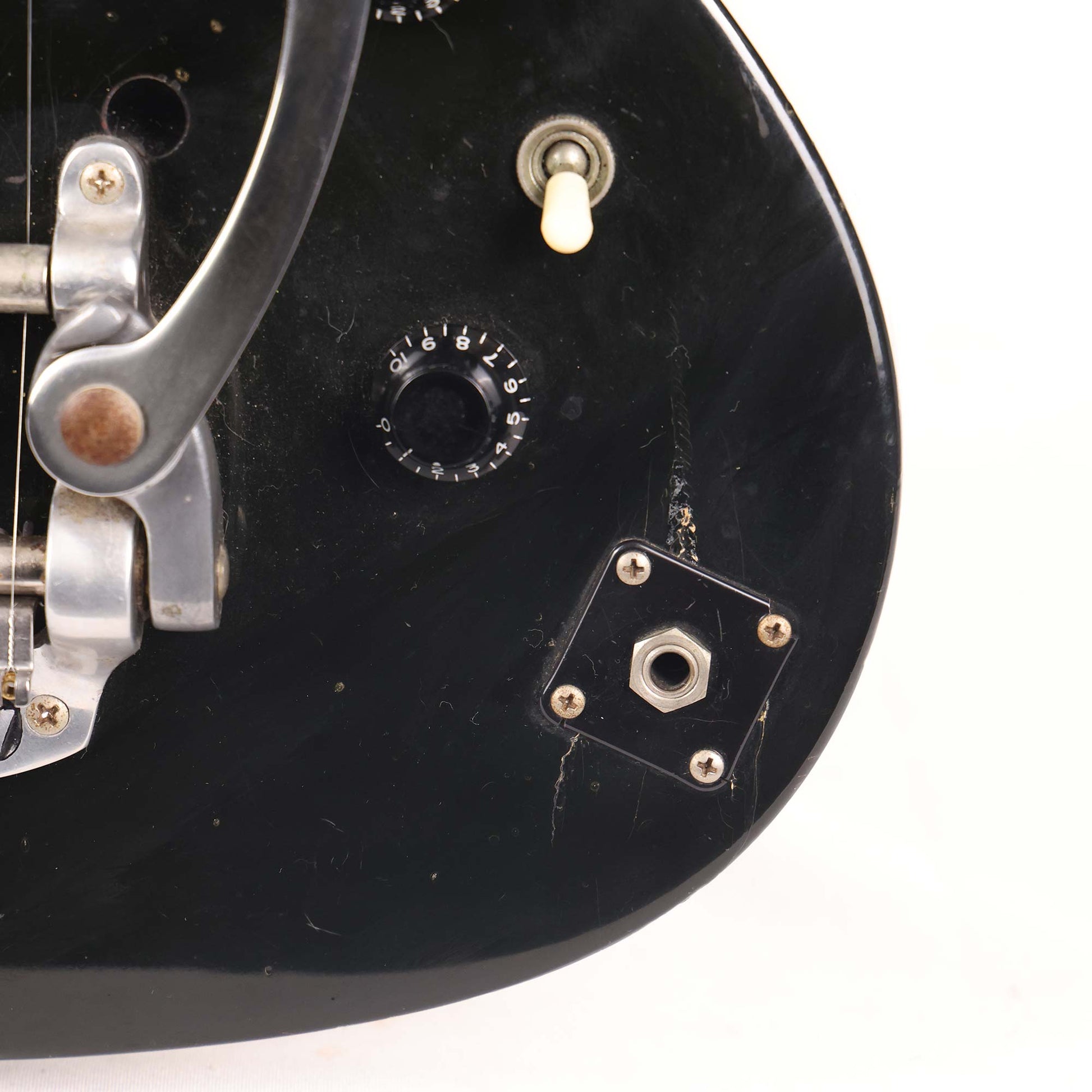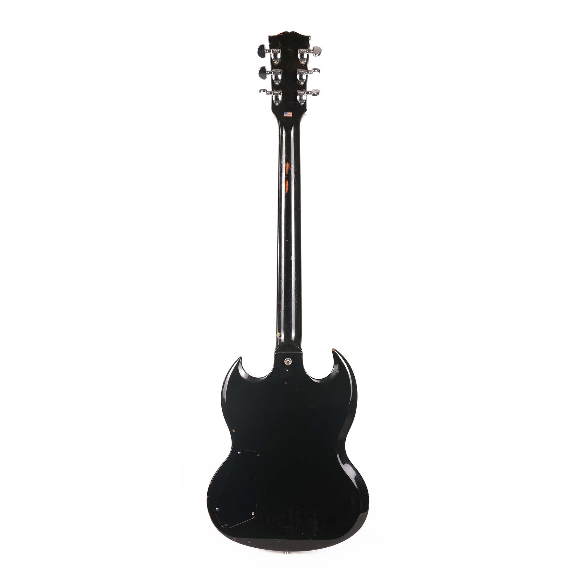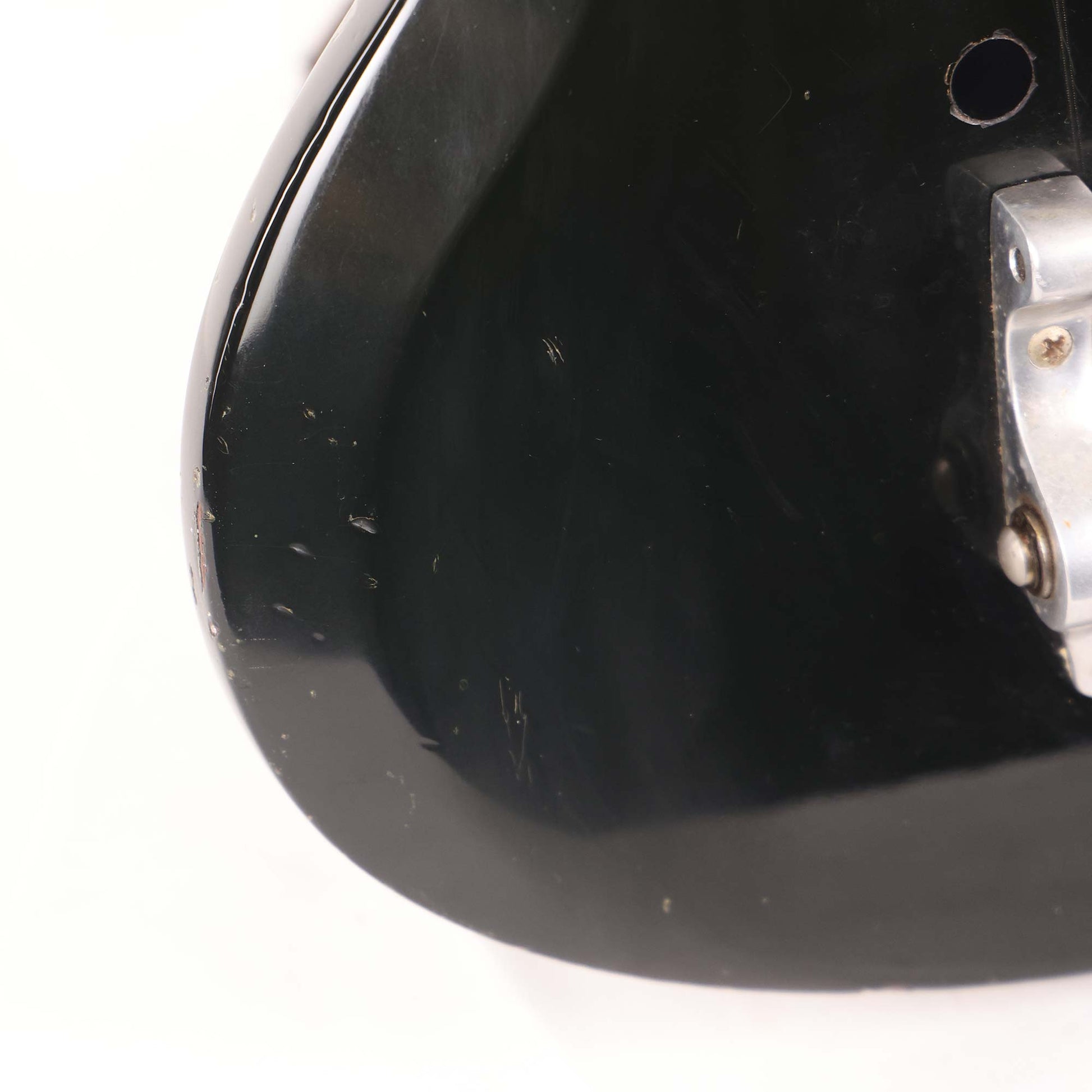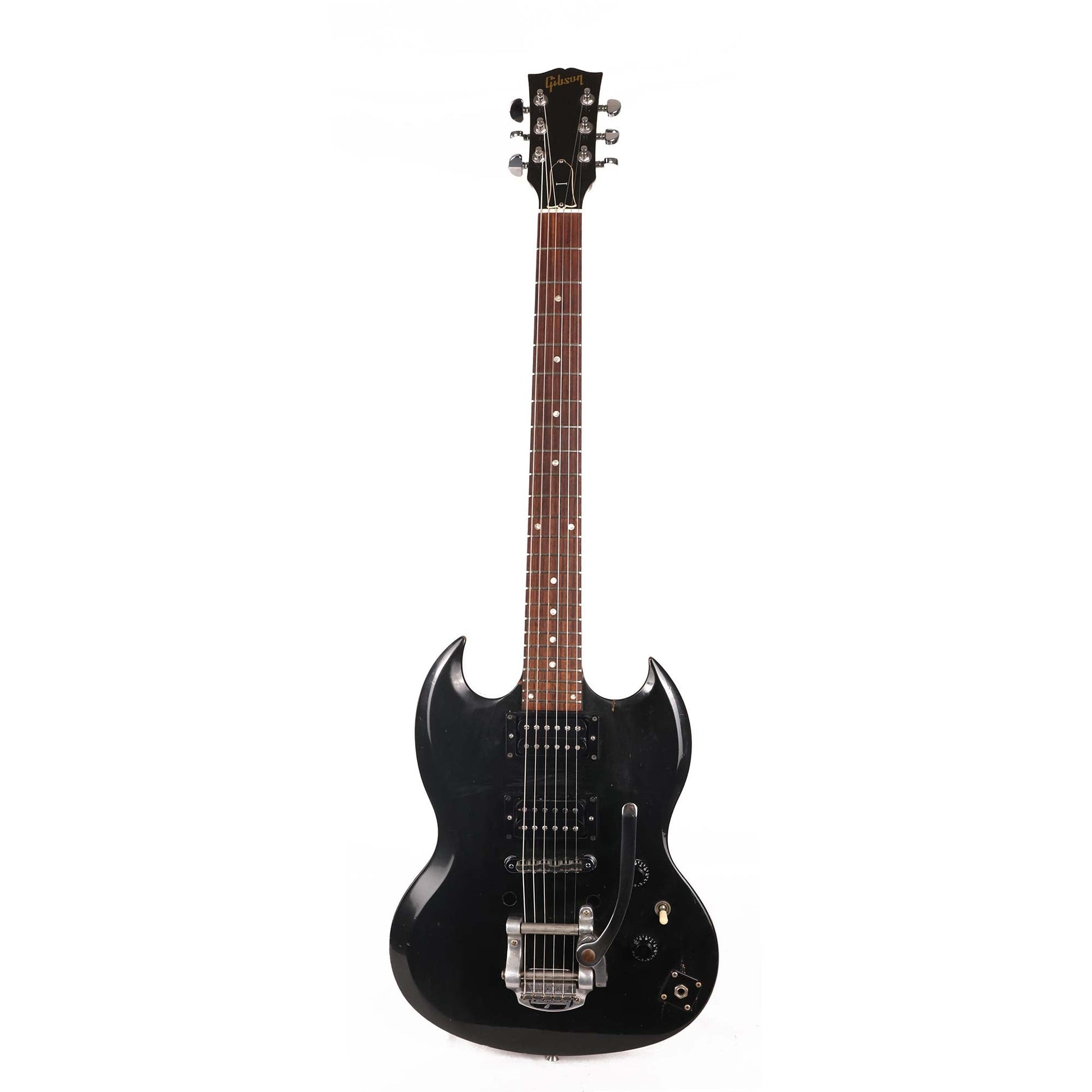 This is a road warrior of a Gibson SG: a 1992 SG-1 in ebony, most notable for its 24 frets and single pickup. Over the course of its life this guitar has been modified for a neck pickup and a Bigsby installed as well as Grover tuners. There's a powerful Duncan Custom Shop IM1 bridge humbucker with a Gibson '57 Classic neck humbucker, and there is a Vibramate spoiler on the Bigsby for easy restrings. The body has playwear throughout and a light amount of fretwear, no dent notes or any excess buzzing. It has a comfortable skinny "C" neck profile and a very fun guitar to play without worrying that you're going to add wear to it, someone beat you to that! A padded gigbag is included.