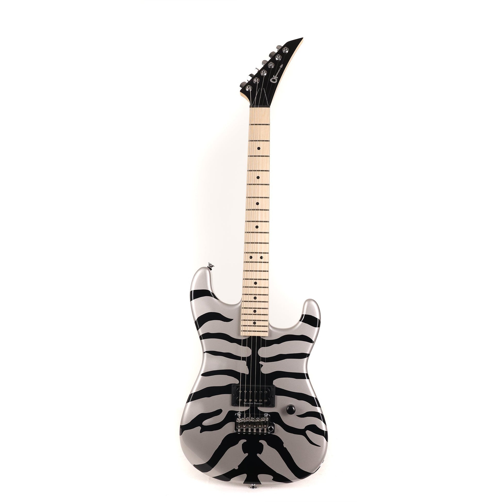 A shredder made for the zoo! This is a limited edition Charvel Super-Stock SD1 in Silver Bengal. It's fitting with a single Seymour Duncan Distortion humbucker wired to a master volume control and set up with a Gotoh 510 tremolo. We love the looks of the black headstock with its pointy six-in-line design! Pick this limited edition guitar up fast!