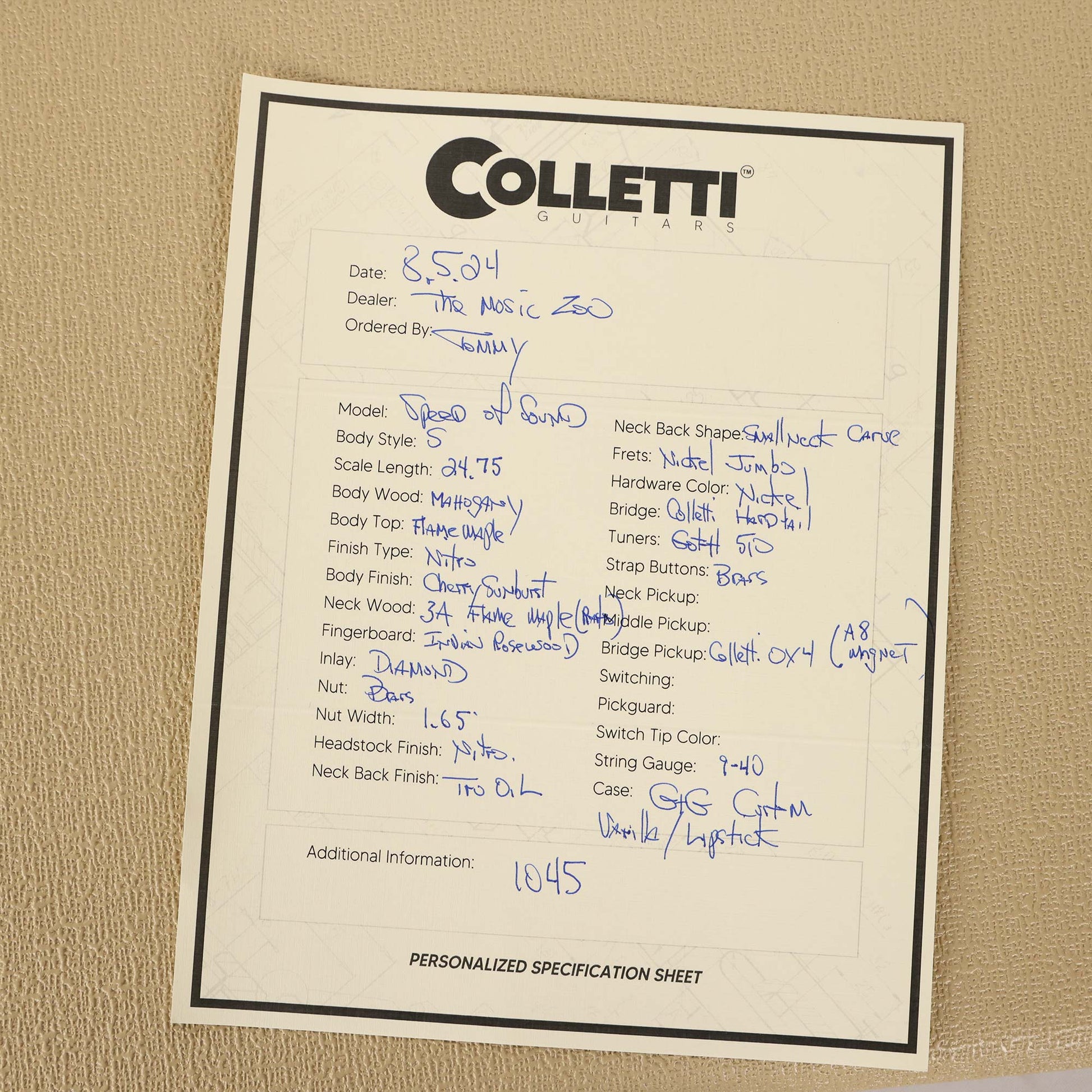 This is the Colletti Guitars Speed of Sound™ serial #1045. This model is built with a Cherry Sunburst finish over the flame maple top, along with a mahogany body and it's paired with a wonderful 3A roasted flame maple neck! For those that want to keep it simple: there's a single OX4 humbucker and a fixed bridge!