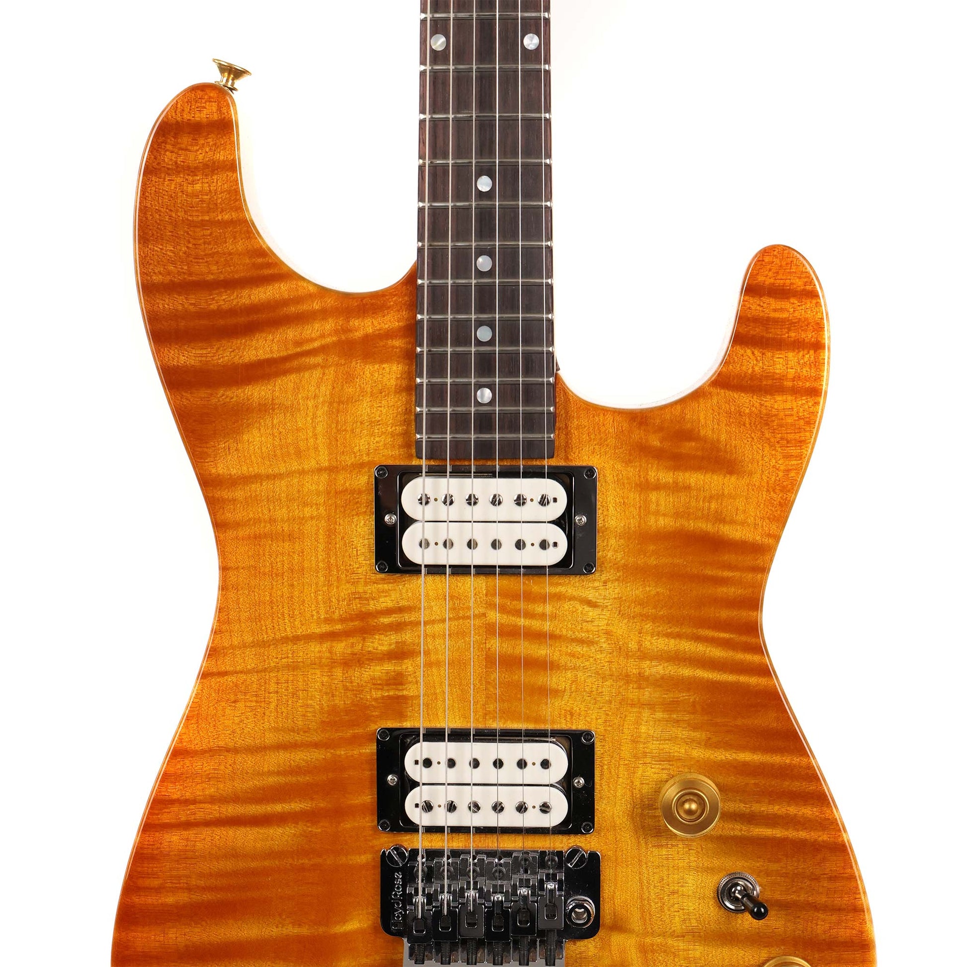 This is the Colletti Guitars Speed of Sound™ serial #1043. This model is built with a beautiful Orange Drop burst finish with nitro lacquer over a flame maple top. For those who want to be able to divebomb - this one features a Floyd Rose 1984 tremolo! This one has some light wear on the body in pick scratches and small dings from being displayed on our showroom floor - no big deal, just some savings passed on to you!