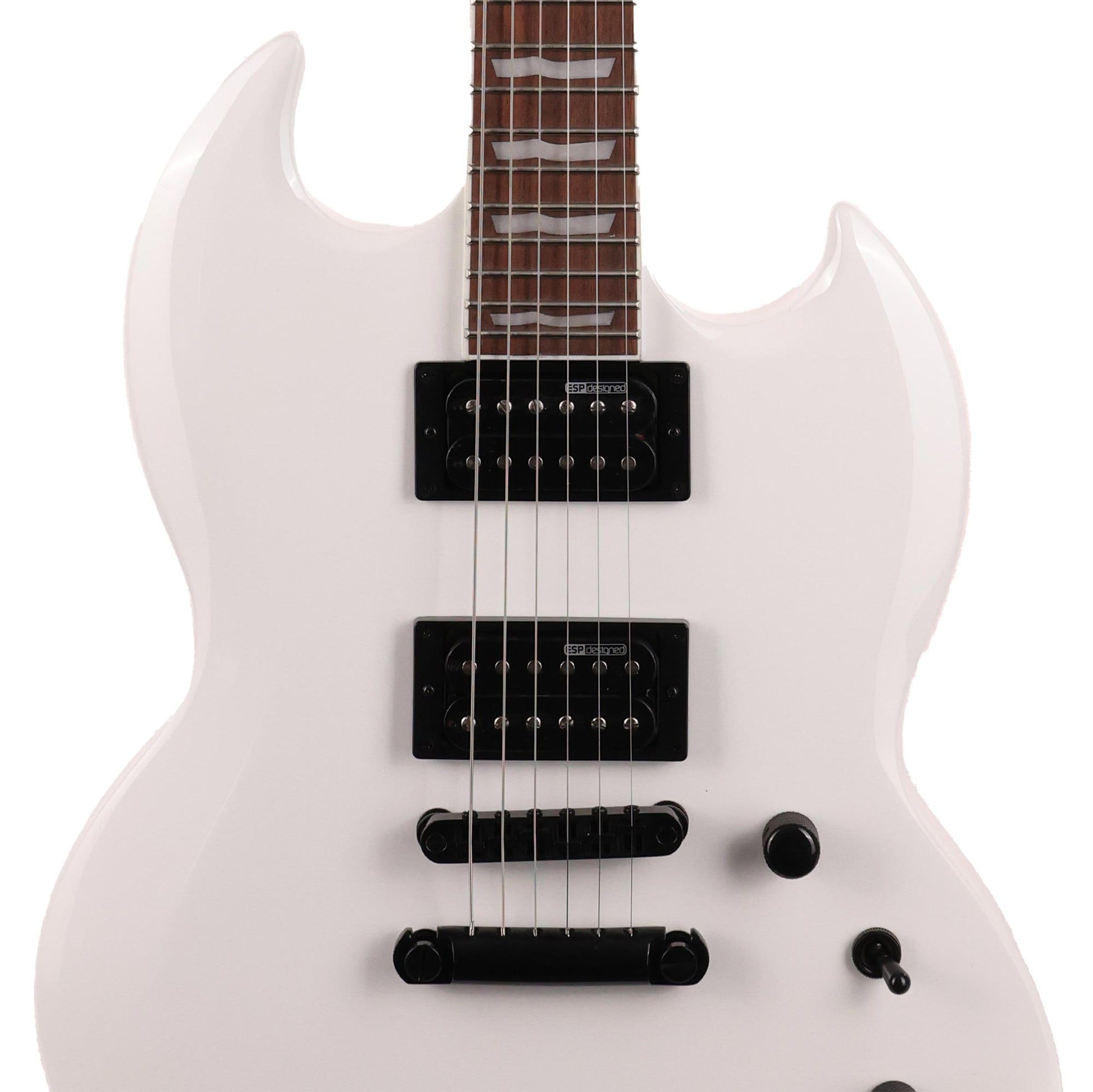 This is a lightly used and still in overall excellent condition Viper from LTD! With the Viper-256, you get the classic vibe of a mahogany-bodied rock and roll machine, this one in a Snow White finish. The Viper-256 offers great features like set-neck construction with a fast three-piece mahogany neck and 24-fret roasted jatoba fingerboard, and a set of high-gain ESP Designed humbuckers as well as LTD tuners and a TOM bridge & tailpiece.
