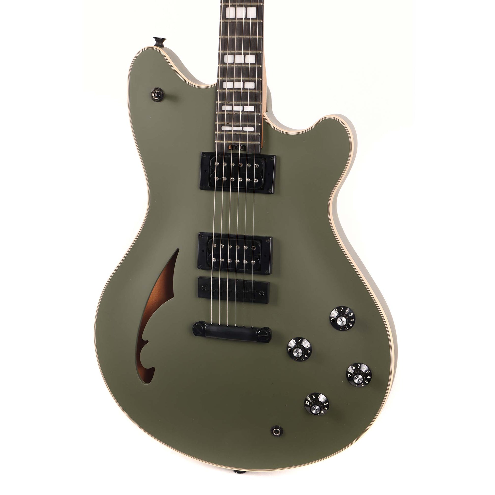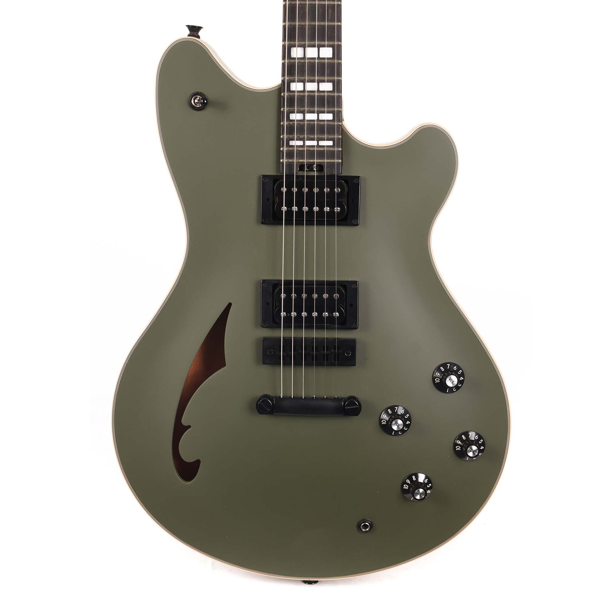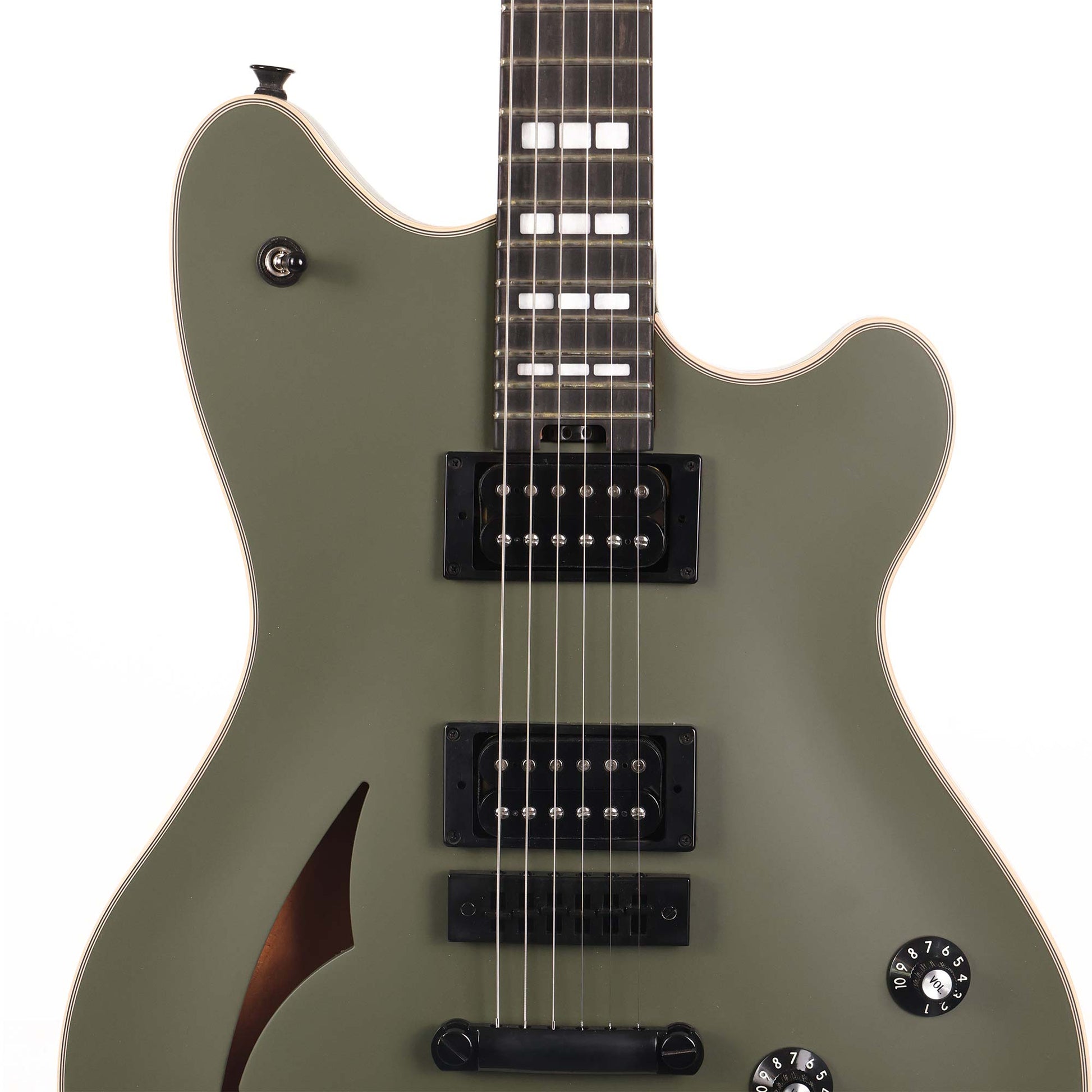 Here is the long-awaited EVH SA126 Special in Solid Matte Army Drab. The SA-126 features chambered mahogany topped with maple, a basswood centerblock and bolt-on satin-finished mahogany neck topped with an ebony fretboard. The design also features Tim Shaw-designed humbuckers that are direct-mounted to the body (a classic EVH spec), the 70's-esque harmonica bridge, individual volume and tone controls per pickup, and a graphite-reinforced neck.