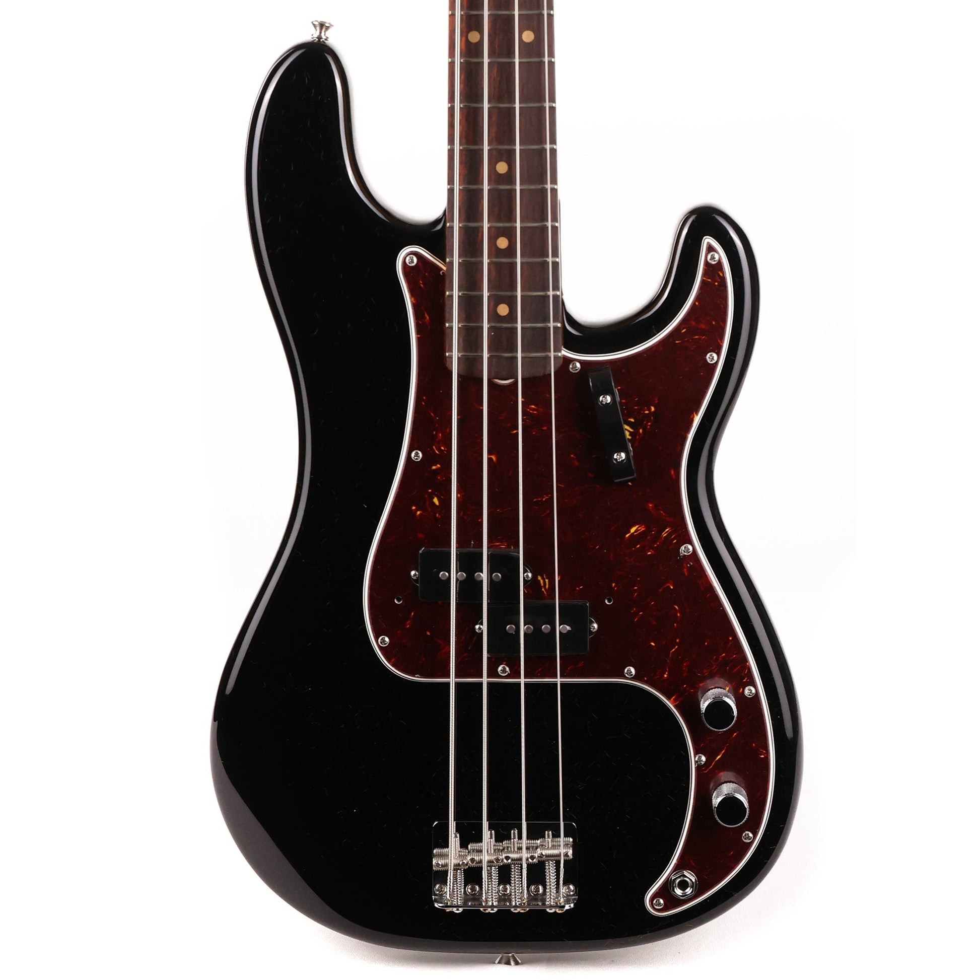 Here's a deal on a very lightly used and in excellent overall condition 2023 American Vintage II 1960 Precision Bass in Black. The American Vintage II Series is a continuation and improvement upon the beloved Fender American Vintage Series that pays homage to Fender's history and heritage. The late ‘50s to the early ‘60s was a watershed period in the development of the Precision Bass®, a time of transition that would see the introduction of many new appointments that would become synonymous with the P-Bass®. By 1960, the design of the P-bass had eclipsed the earlier cues culled from the Telecaster® - now the P-bass had a Strat®-style headstock shape, comfort-contours, pickguard mounted electronics and 4-saddle bridge. Adorned in 3-Color Sunburst and topped with a 4-ply tortoiseshell pickguard, the 1960 Precision Bass represented a more refined, enduring aesthetic for the model. Featuring a premium alder body, Pure Vintage ‘60 Split-Coil P-Bass pickup and a substantial “C” shape hard rock maple neck mated with a 7.25” radius slab rosewood fingerboard, the American Vintage II 1960 Precision Bass reproduces the quintessential tone and feel of the original. If you want an American-made Fender that has all of the historically-accurate parts and tones, it doesn't get much better than the American Vintage II series!