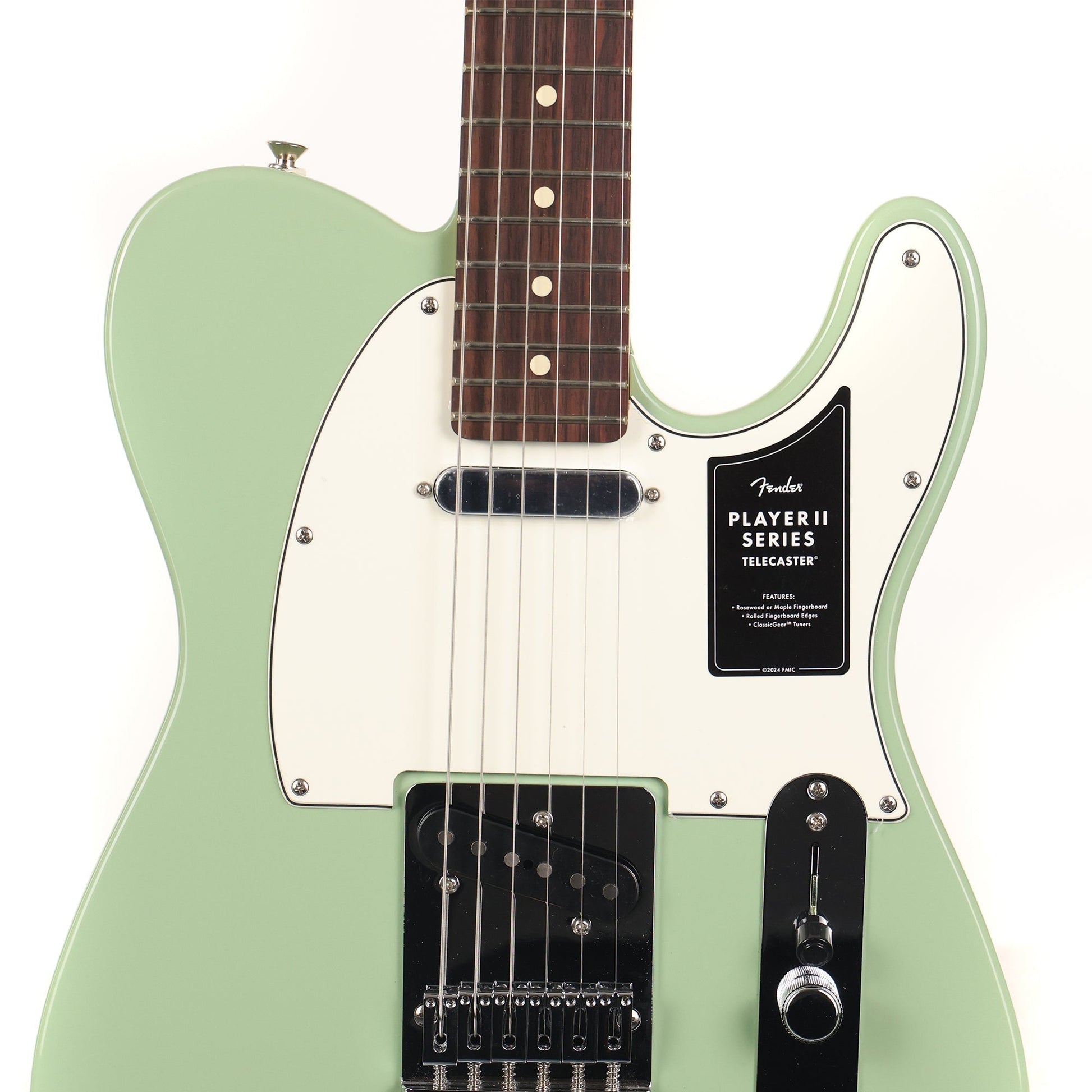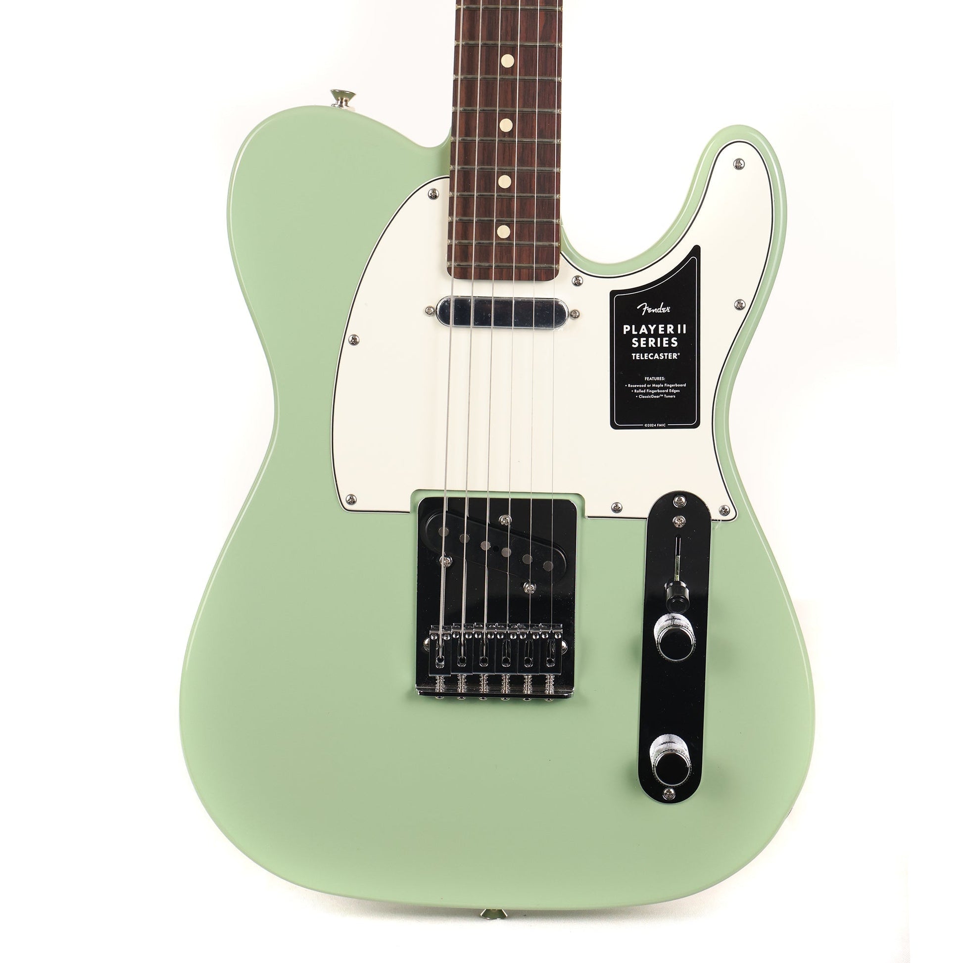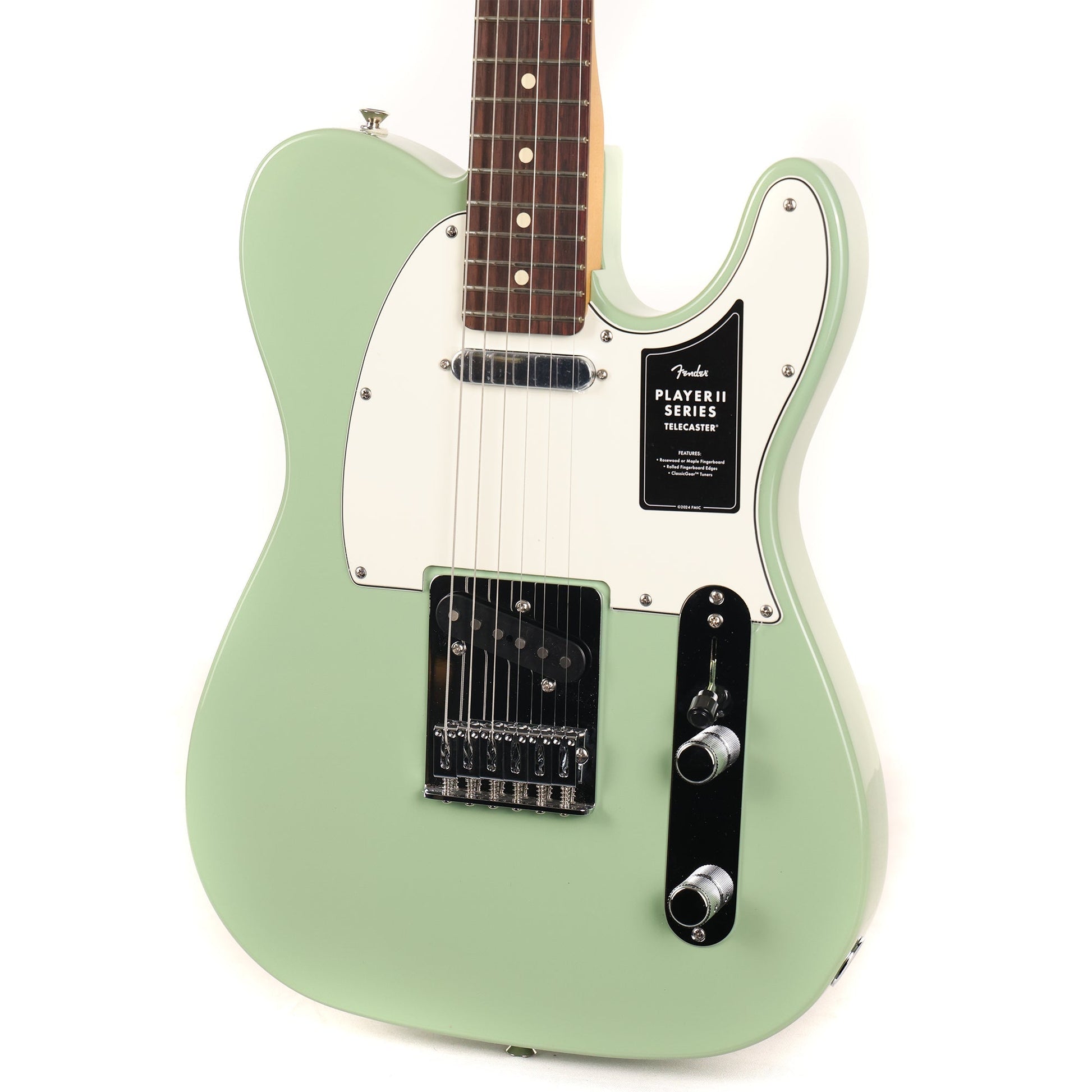Updated features on the Player II Telecaster include the return of rosewood fretboards on select finishes, a modern "C" profile neck with rolled fretboard edges and fresh never-before-seen Fender colors. Player Series Alnico V Single-Coil Tele® pickups offer crystalline highs, musical mids and tight lows that elevate any genre. The 3-way blade switch lets you dial in everything from smooth neck pickup chime to cutting bridge pickup twang and all points in between, while a 6-saddle bridge, block steel saddles and ClassicGear™ tuners ensure precise tuning stability. Pick up your Player II Fender guitar at The Music Zoo today!