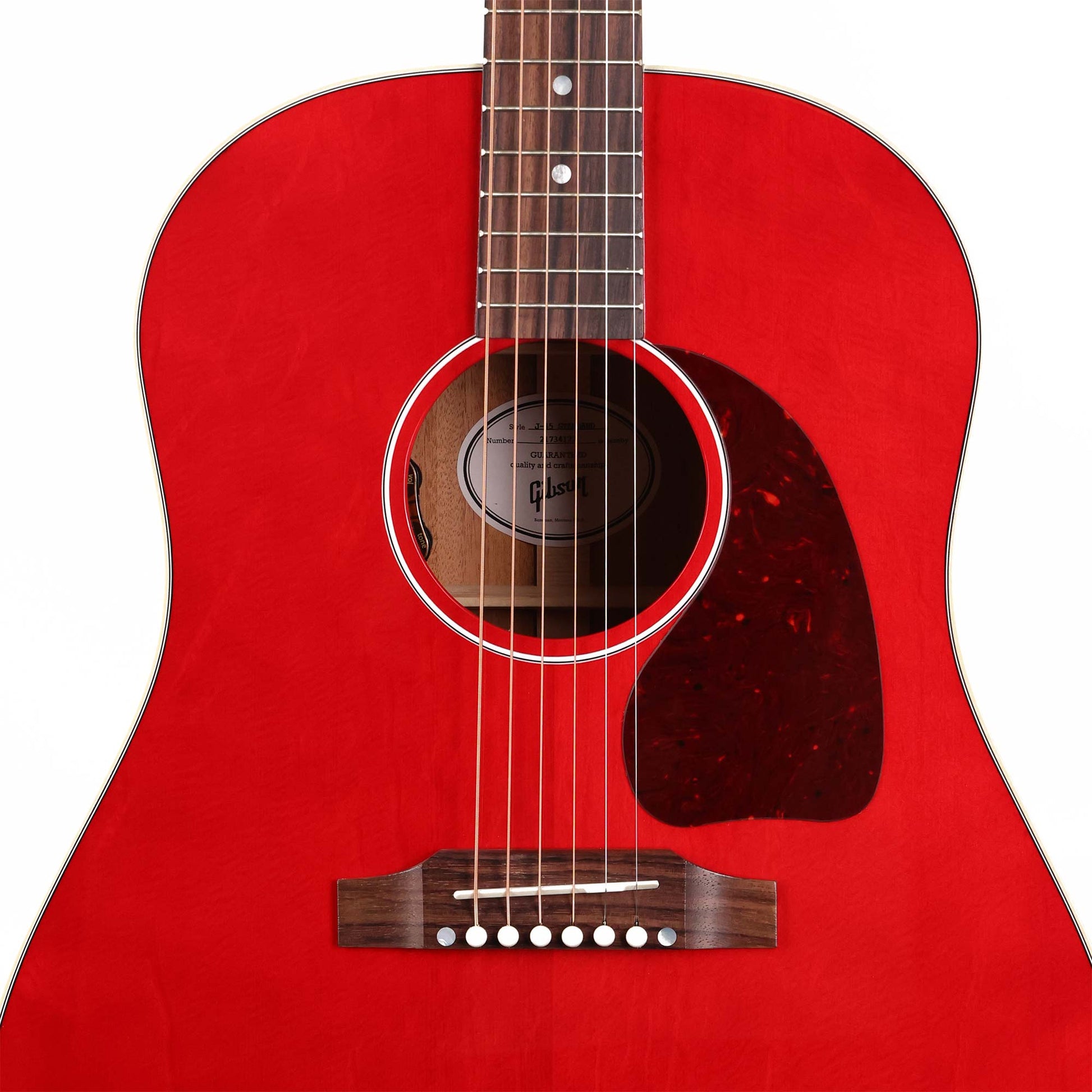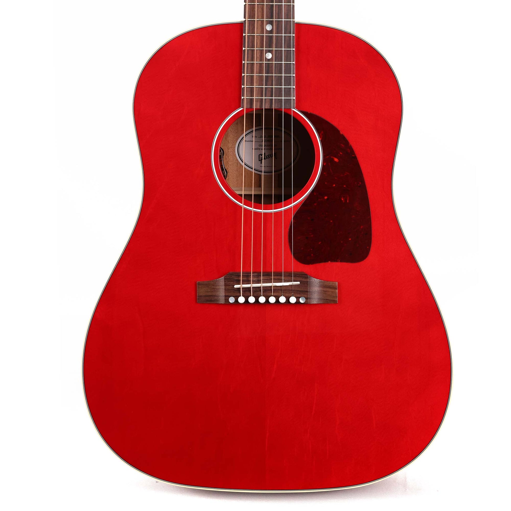 This is a Gibson J-45 Standard in a beautiful Cherry Red finish. The J-45 has been Gibson's top-selling acoustic guitar for years. Nicknamed "The Workhorse" and first introduced in 1942, Gibson's most popular acoustic is now the icon of its round-shoulder, dreadnought line, world renowned for its full, balanced expression, warm bass, and excellent projection. The Sitka Spruce top and Mahogany back and sides provide all of the great tone Gibson's dreadnoughts are known for, and the L.R. Baggs VTC electronics ensure your tone is carried over when you plug in.