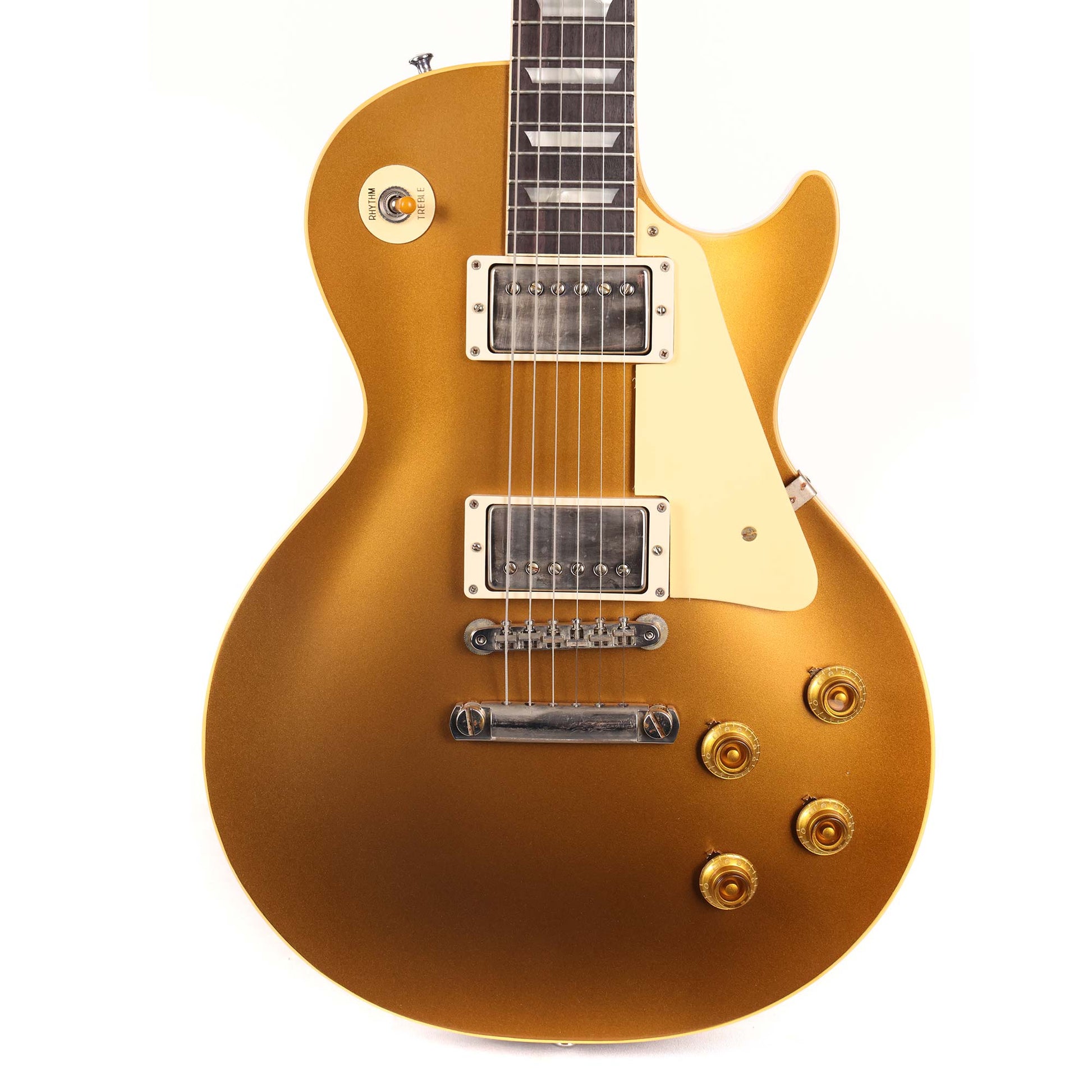 Here's a fantastic '57 Les Paul reissue from the Gibson Custom Shop lineup! The guitar has a Goldtop with Darkback finish, adding a dark red stain to the mahogany body. The guitar has a pair of Custombucker pickups, and a VOS finish to add a light patina to the hardware as well as dial the glossiness back a bit.