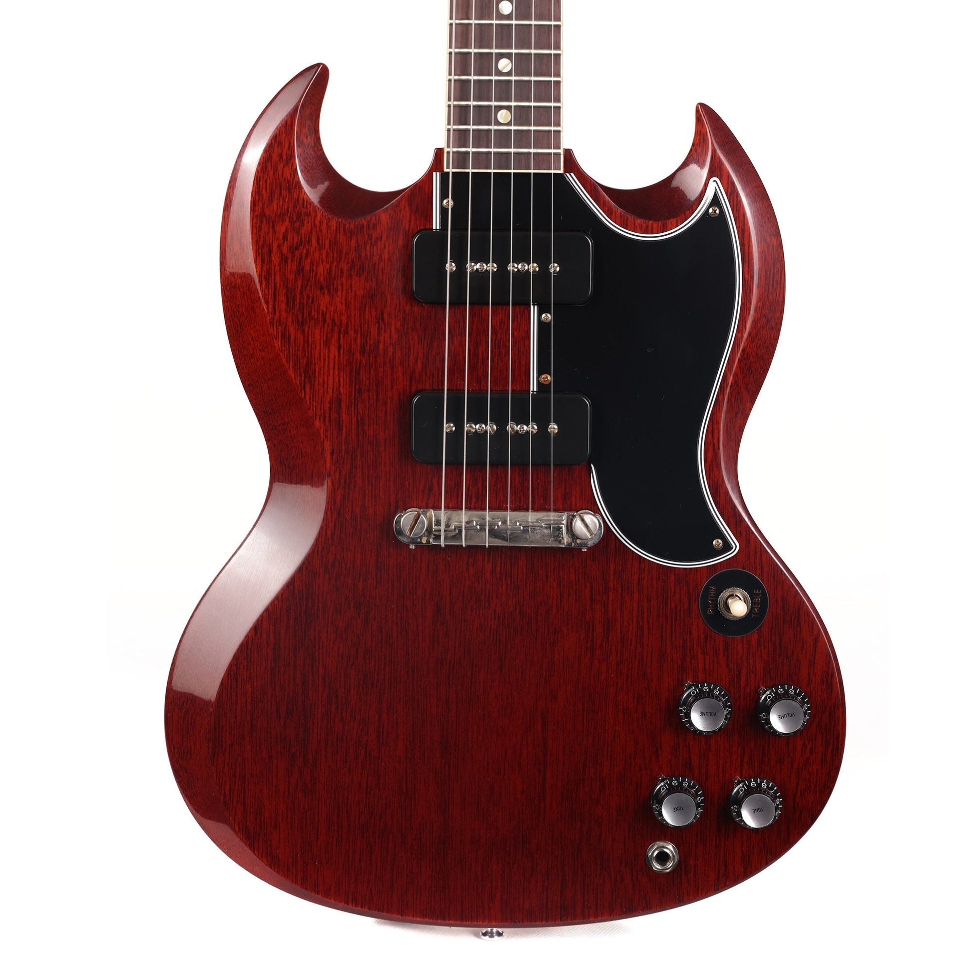 SG Specials: a classy bound rosewood fretboard, wraparound tailpiece for that nice and loose feel, and two fat sounding P-90s. You can't go wrong! This is a ’63 SG Special reissue, built with a VOS Cherry Red finish, and a lightning bar bridge to assist with intonation.