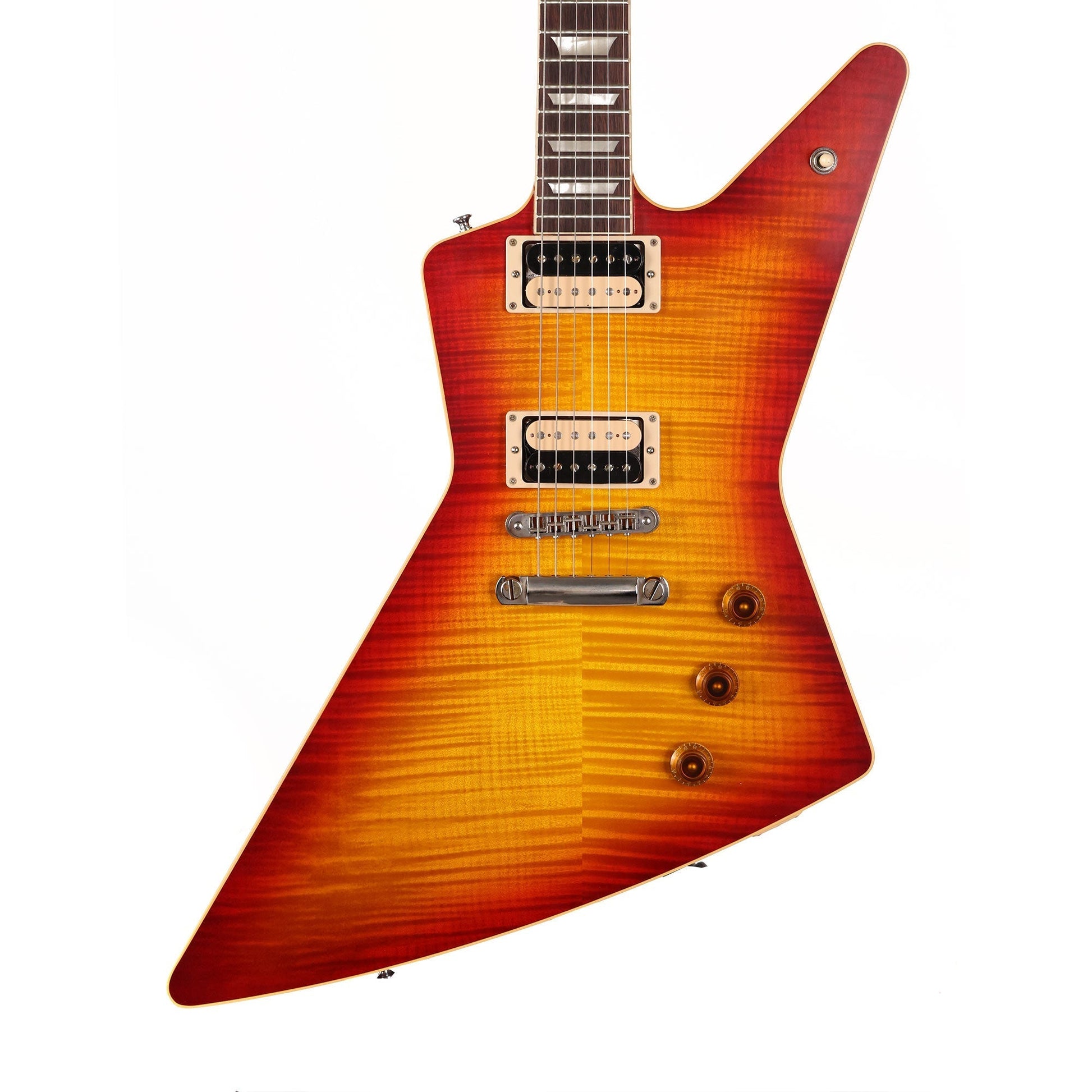 Another Music Zoo dream guitar come to life! This is a Gibson Custom Shop Explorer Custom given a 'Standard' treatment with a flame maple top, single-ply cream binding and pearl trapezoid inlays all wrapped up in an Antique Factory Burst VOS finish and we went with aniline cherry red dye for the back and neck just like you'd find on a historic Les Paul! This one is loaded up zebra-bobbin Custombuckers wired to individual volume controls with a master tone. This is a true Rock and Roll monster, and it's hard to believe but this Explorer came in at a very light weight!