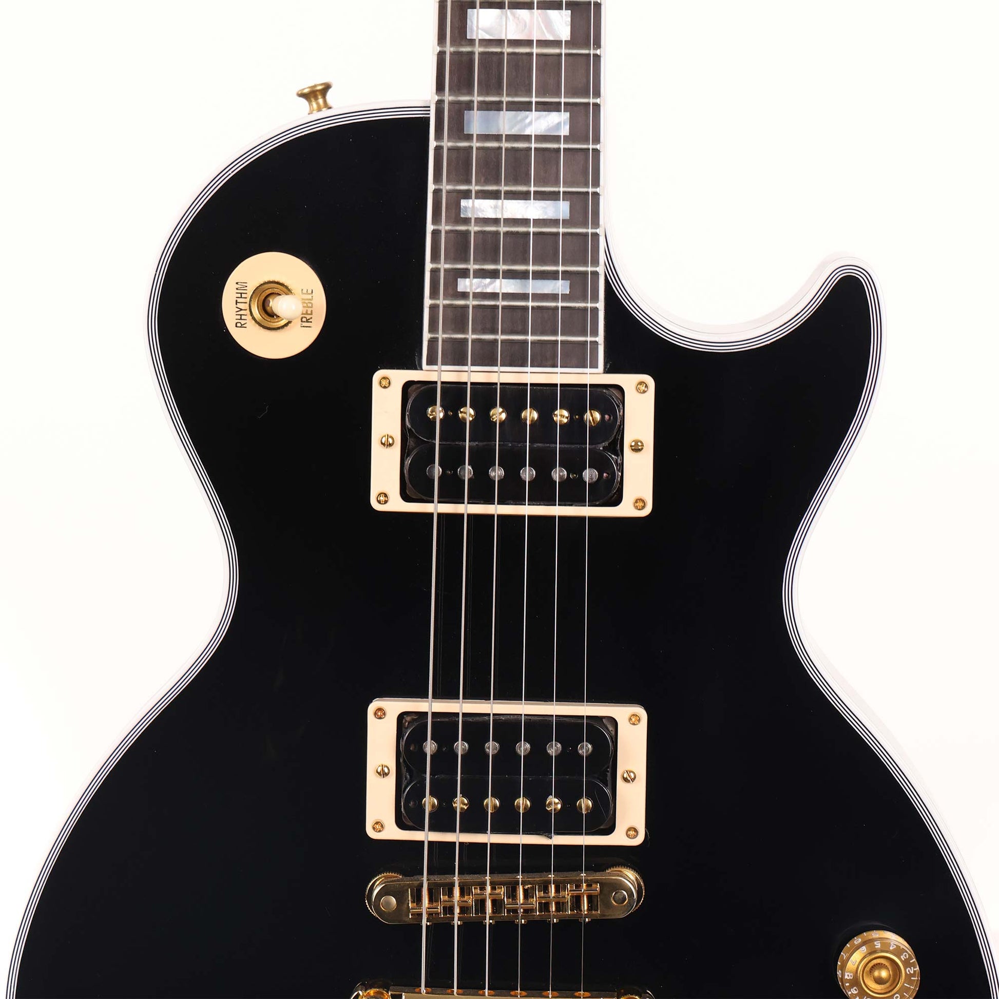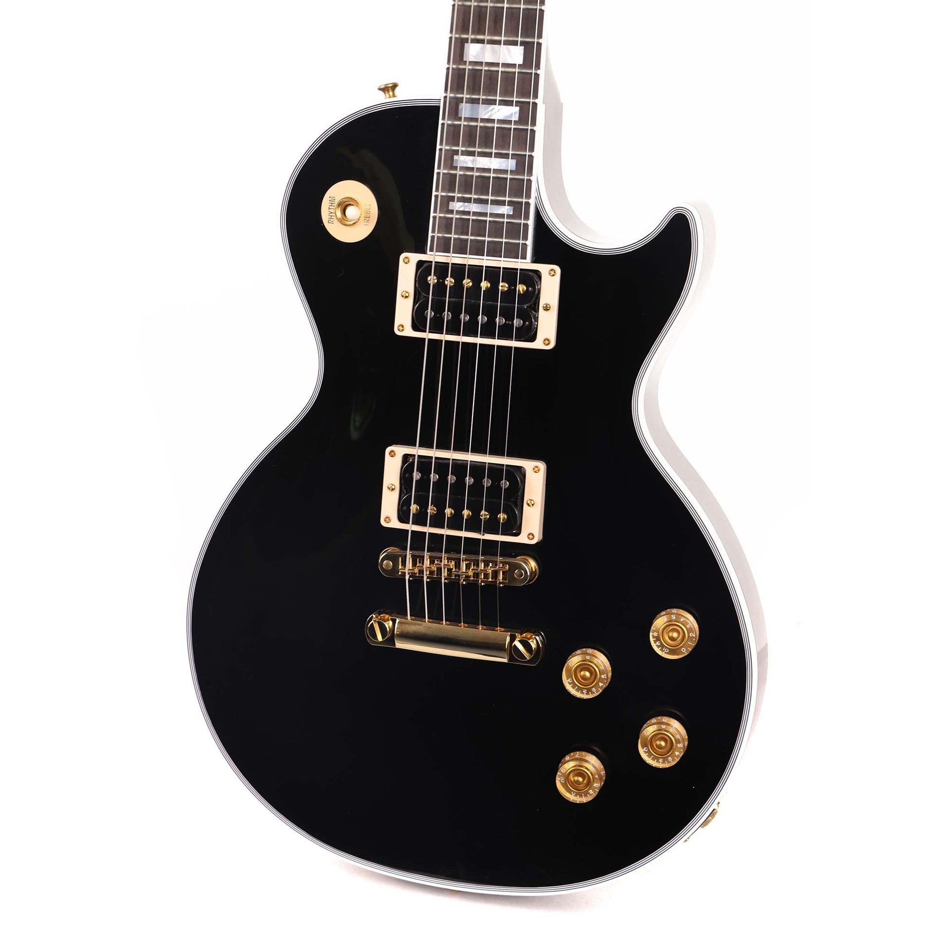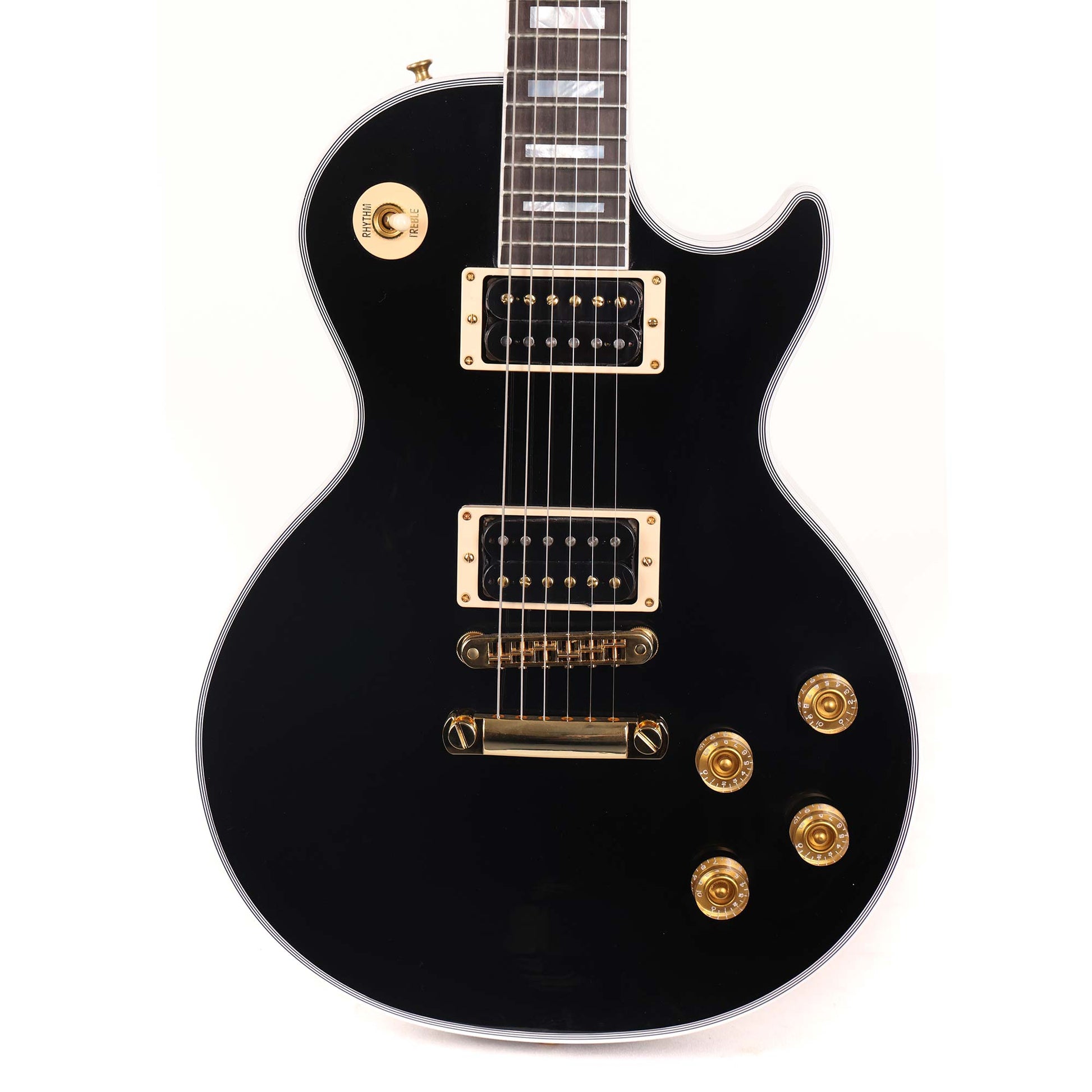 A class act of a Les Paul Custom! This is a Zoo-spec'd model with a VOS Ebony finish paired with gold hardware, cream plastics and a set of uncovered Burstbucker pickups with black bobbins and gold screws! Plug this into your favorite stack and let those '70s Hard Rock riffs start flying out!