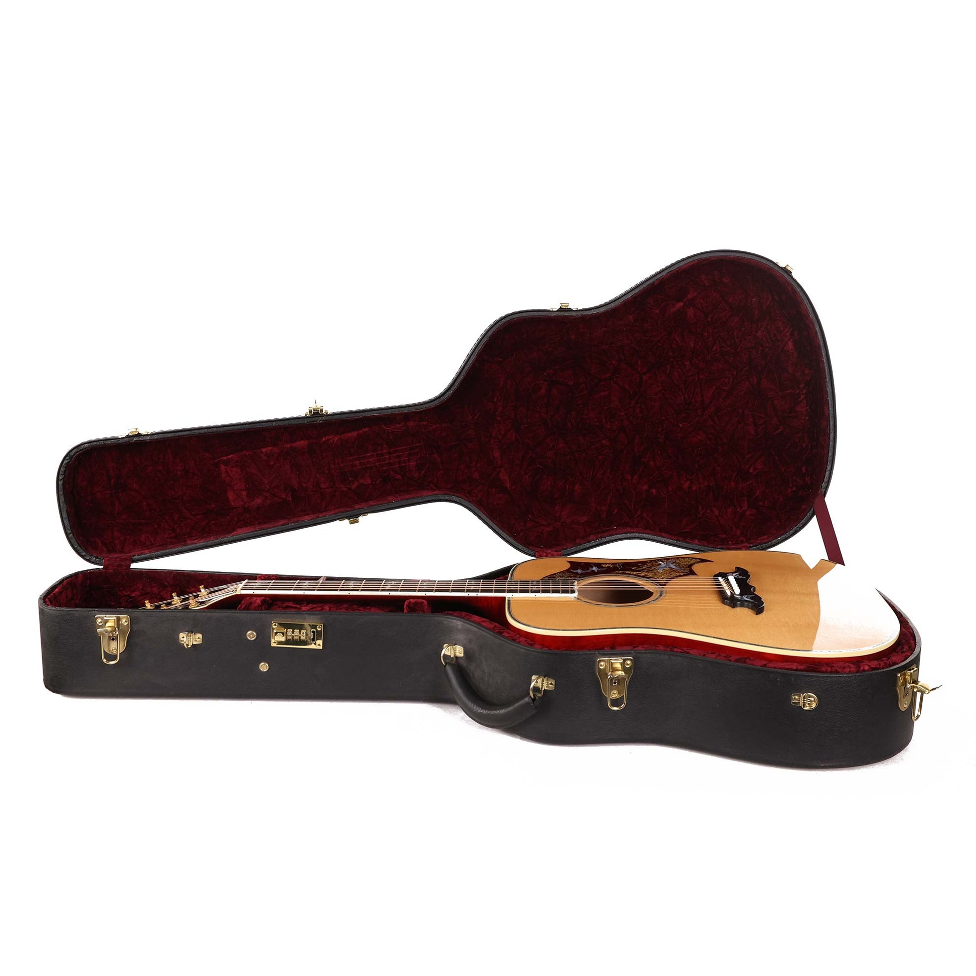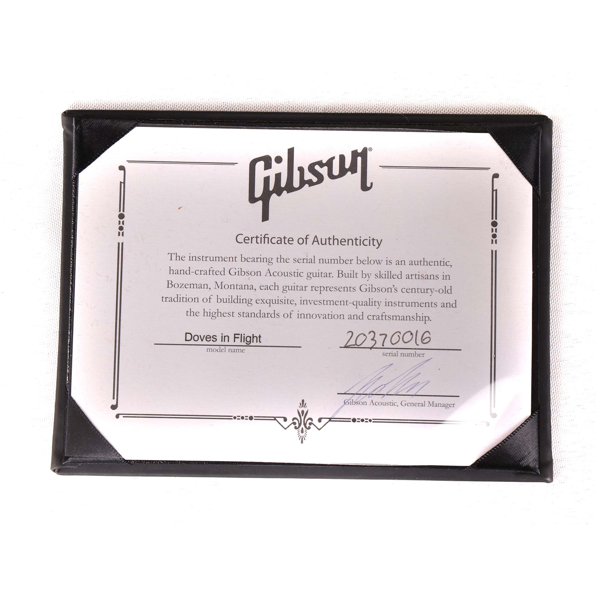 Originally sold here at The Music Zoo in 2020, this is a lightly used and incredibly ornate Gibson Doves in Flight model built in Montana with a wood set of figured maple and adorned with Doves in Flight inlays and a hand painted pickguard. The guitar has a rock-solid 3-piece maple neck and a dark Richlite fretboard. The guitar also features hand-engraved gold Keystone tuners, and a handpainted pickguard. It remains in excellent condition with little to no playwear on it and the original case with COA included.