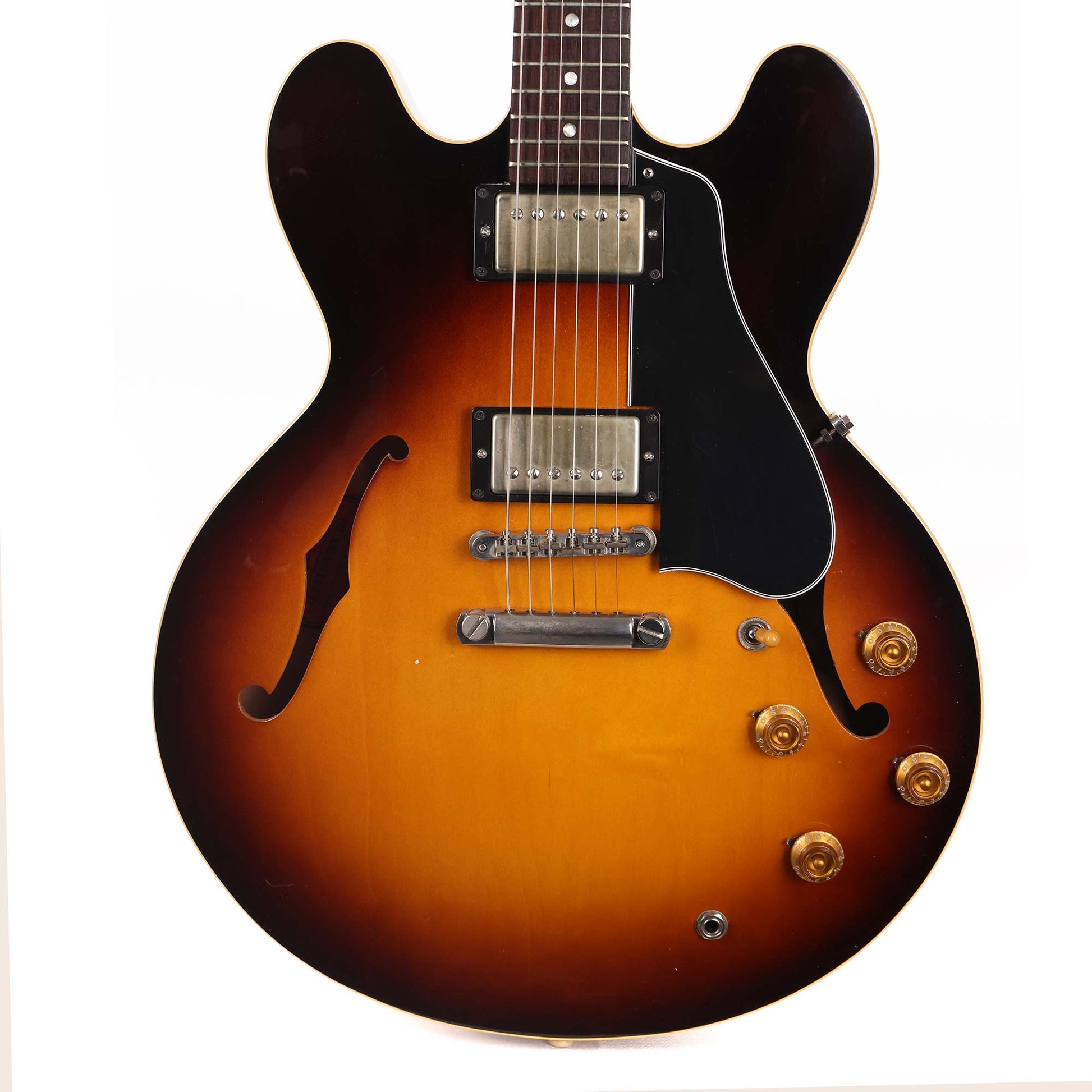 This is a lightly used Gibson '58 ES-335 reissue built at the Memphis factory in 2018. The guitar has the period-correct 'Mickey Mouse' body shape along with an unbound rosewood fretboard and a chunky '58 neck profile. The guitar has a bit of wear to it on the top: mostly scratches in the finish and the pickguard as pictured, with some light dings around the bottom F-hole, but nothing which affects the feel! The original case and COA are included!