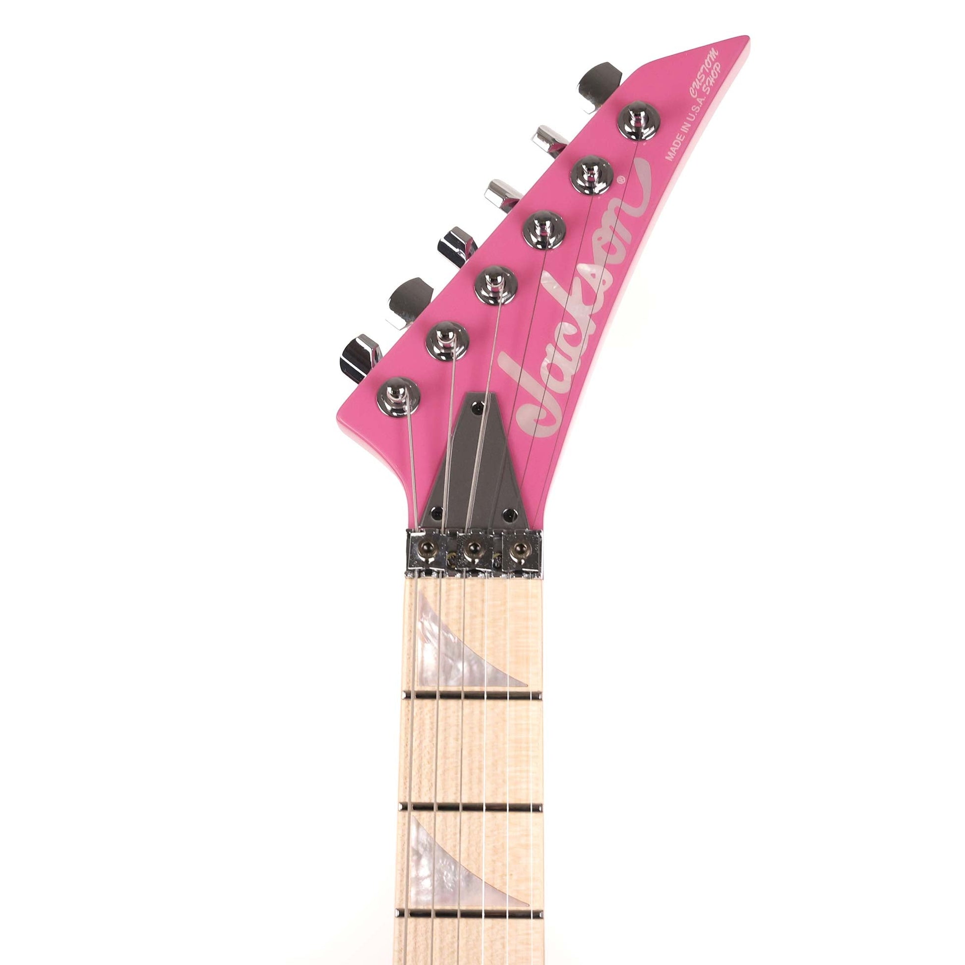 Here's a bright and eye-catching Soloist spec'd by us here at the Zoo! A Humbucker-Single model although looks can be deceiving because it's still a humbucking Seymour Duncan Lil '59 in the neck position! The guitar has a maple board for added snap and it's inlaid with pearl sharkfins and a matching Jackson headstock logo. Add in the non-recessed Floyd Rose tremolo for your divebombing needs and the complementing color of the mint green pickguard, this is a Jackson that's sure to turn heads and capture attention.