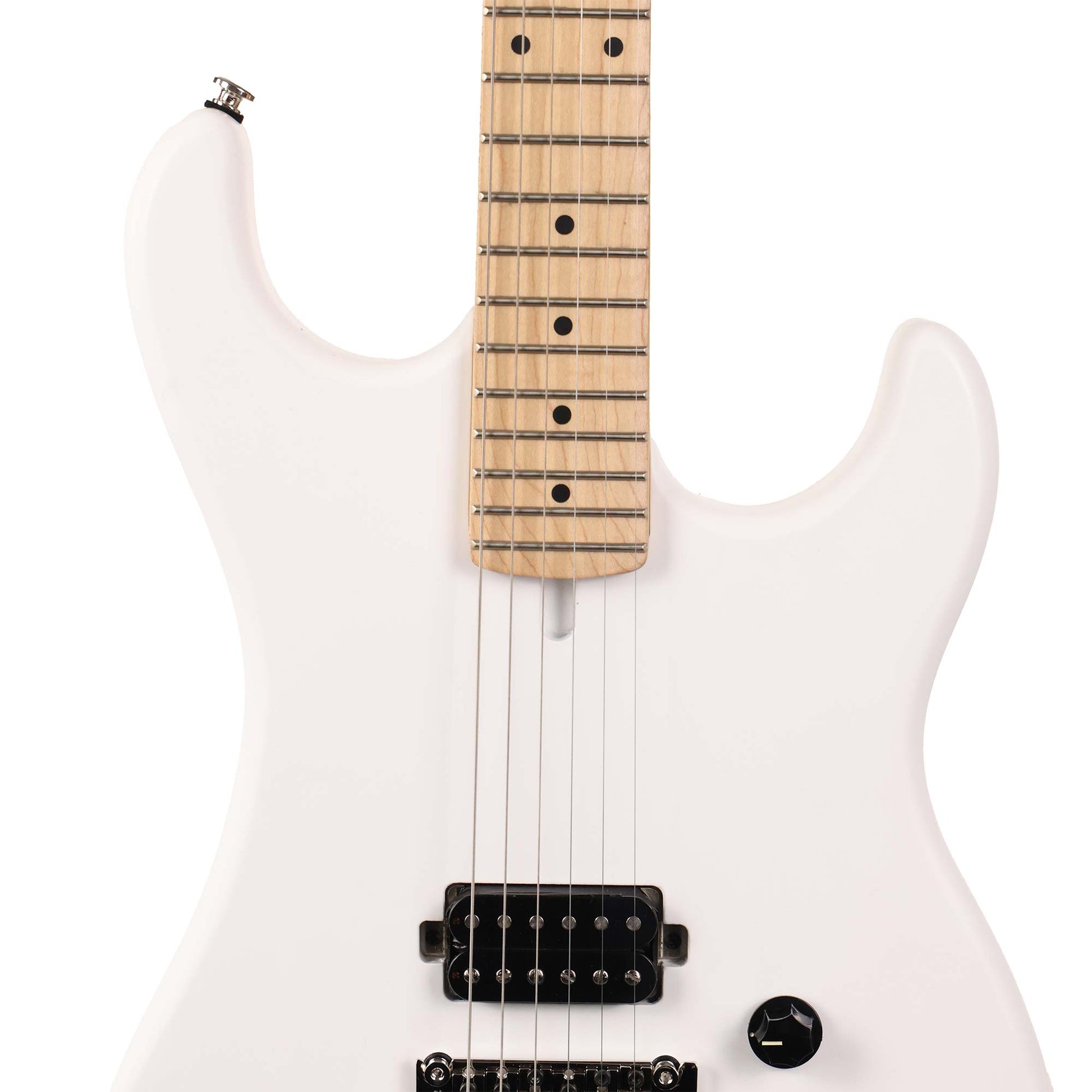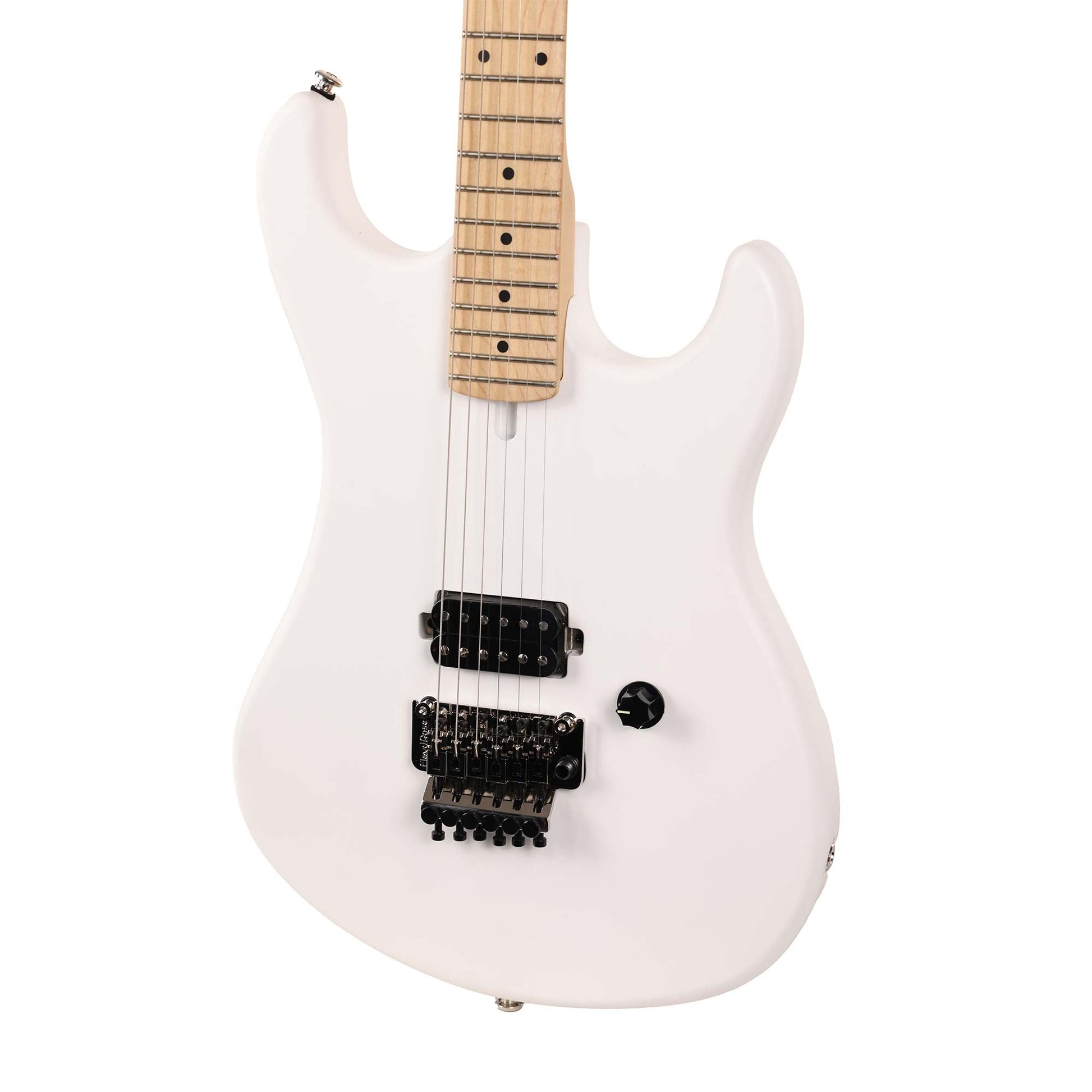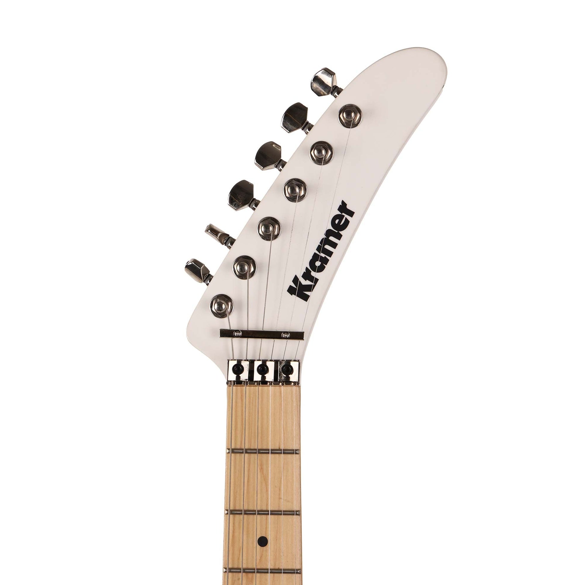 A single-humbucker shredder from Kramer - this is The 84 in a fresh Angel White Satin finish updated to be even closer to the original 1980s model with its rear headstock 'stinger' finish, a direct-mounted pickup and '84 banana headstock design. The guitar has a Kramer USA Eruption T humbucker that Gibson Master Luthier Jim DeCola designed and it's wired to a retro-styled knurled volume control. The control is also a push-pull pot for series/parallel operation! For hardware: die-cast tuners and a Floyd Rose 1000 series tremolo with a locking nut! Each Kramer The 84 includes a premium gigbag for safe travels.