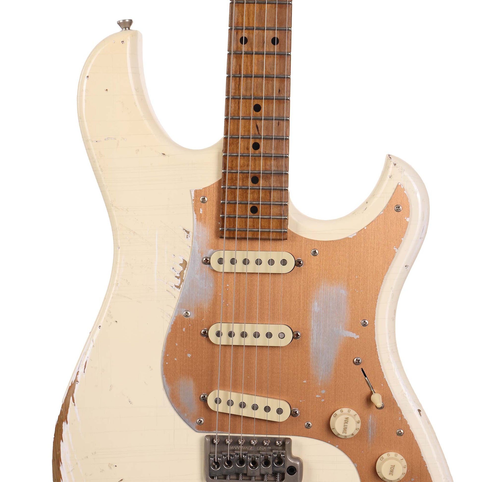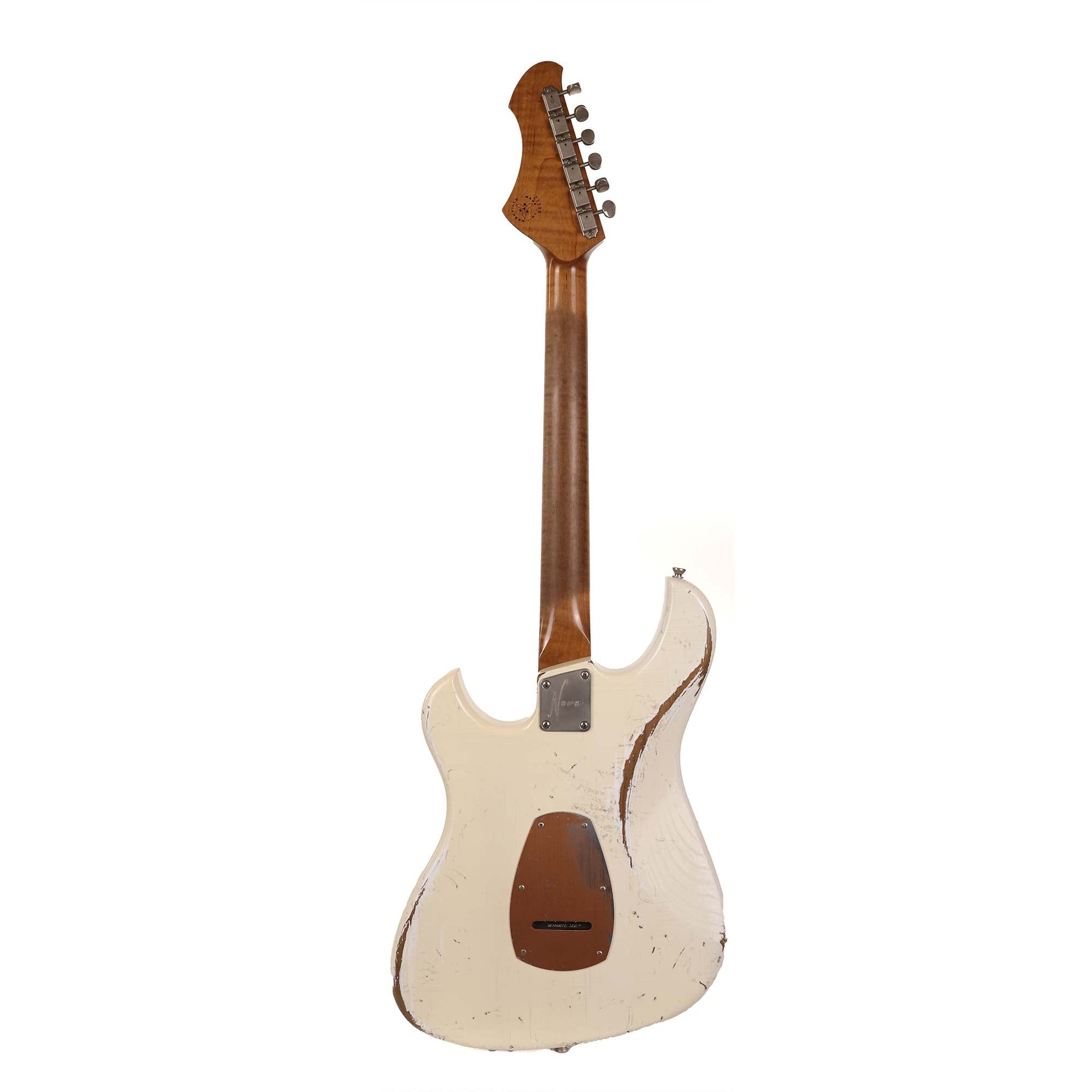 Here's a funky offset guitar from the Novo company: their Idris S3 model in Olympic White. This one is in used but excellent condition with all wear original to how Novo intended it to look and feel. Features include a tempered pine body with matching tempered maple for the neck and fretboard, three Fralin Vintage Hot Strat pickups and a MannMade tremolo bridge. The guitar includes the original Mono bag with trem arm and spec sheet!
