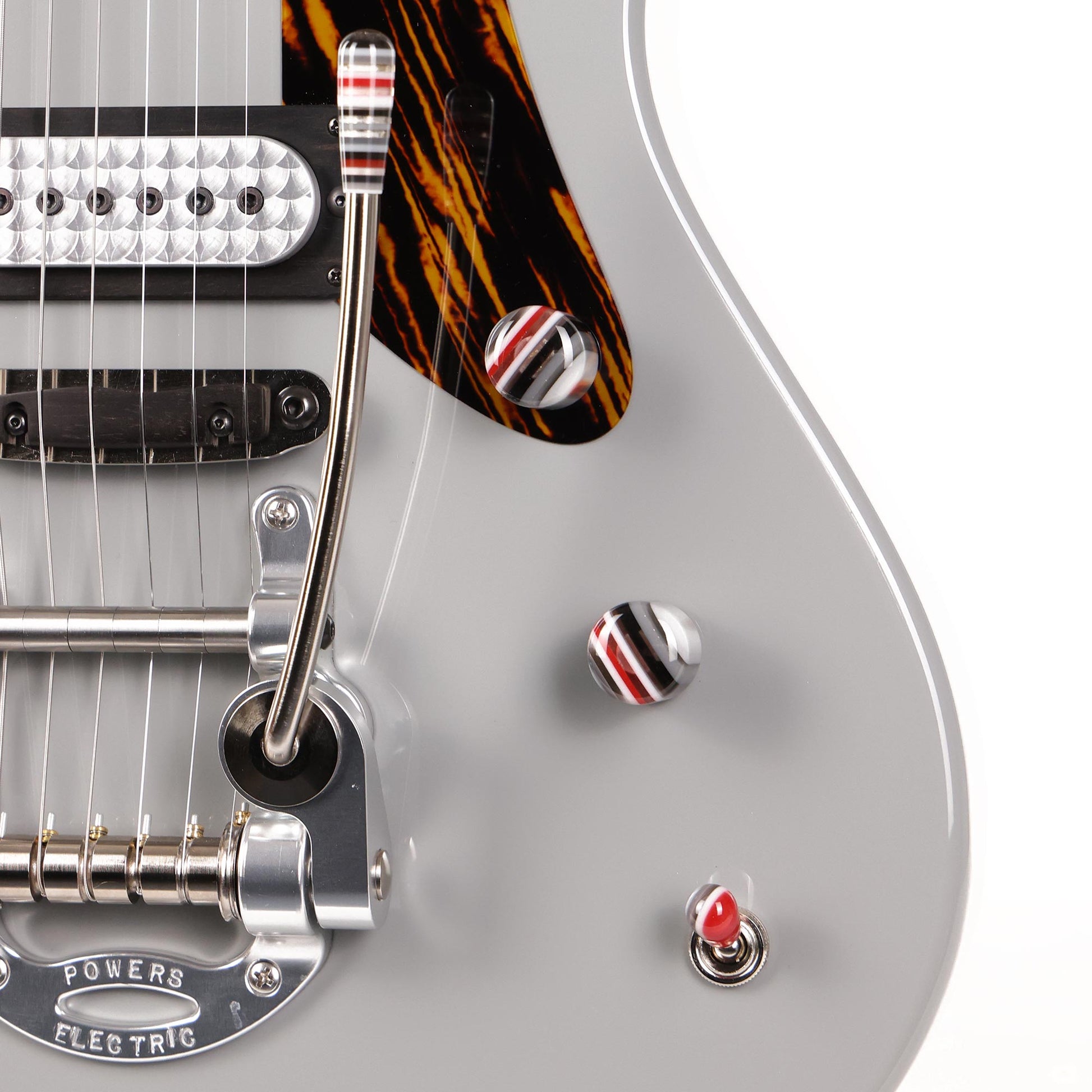 With the exception of the tuners, all of the hardware is made in house at Powers Electric. The tailpiece is a vibrato unit with a special camshaft that's designed to bend the notes in pitch unison just like you'd find on a lap or pedal steel guitar. The knobs and tremolo arm tip are handmade of colorful resin and inspired by the excess material when glassing a surfboard, or if you're old enough to remember - "Fordite", which was the excess paint that came from hand-spraying cars in the 1950s. If you think you already have a guitar collection full of all the tools you need, we encourage you to add a Powers Electric to the arsenal! It might just be your new secret weapon.