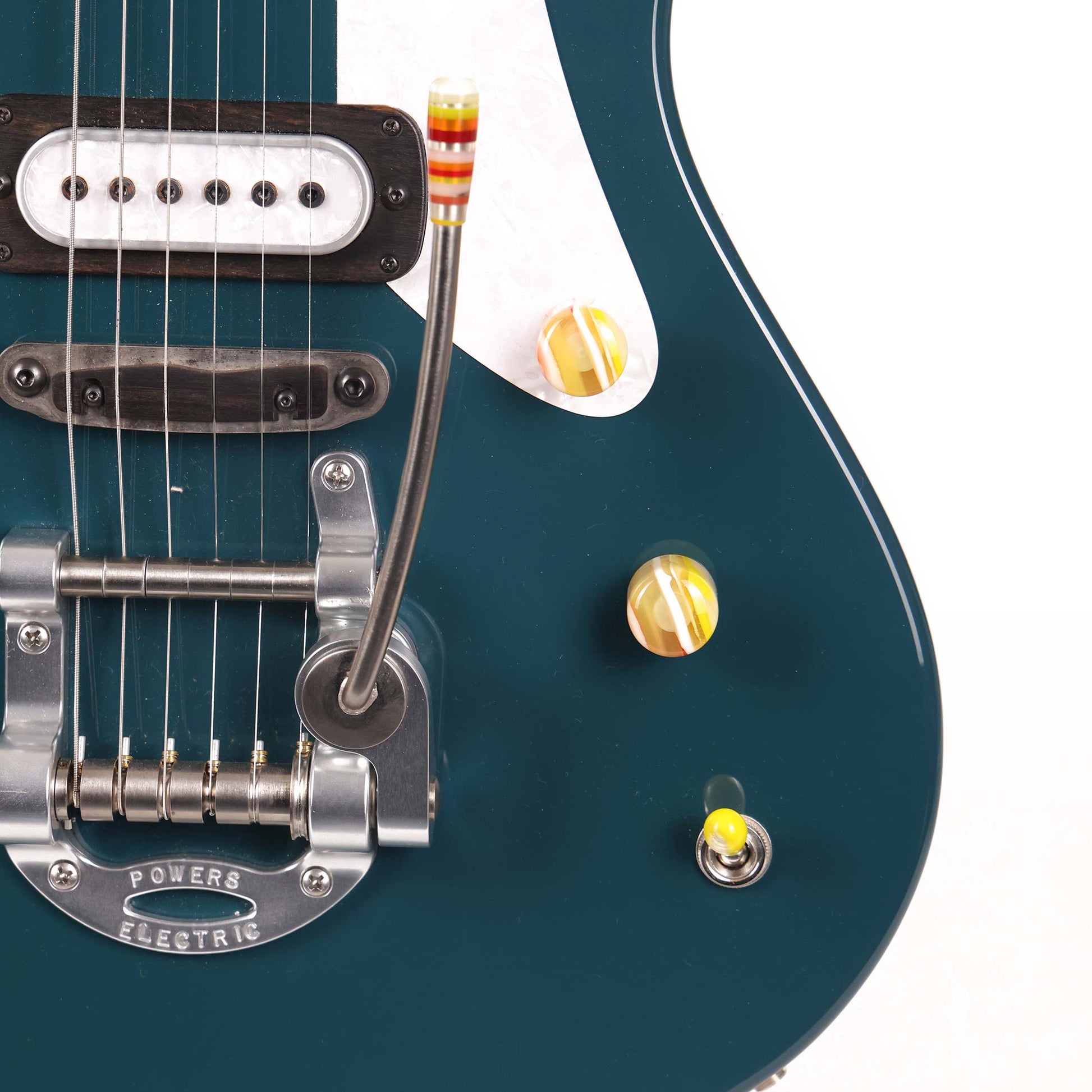 With the exception of the tuners, all of the hardware is made in house at Powers Electric. The tailpiece is a vibrato unit with a special camshaft that's designed to bend the notes in pitch unison just like you'd find on a lap or pedal steel guitar. The knobs and tremolo arm tip are handmade of colorful resin and inspired by the excess material when glassing a surfboard, or if you're old enough to remember - "Fordite", which was the excess paint that came from hand-spraying cars in the 1950s.
