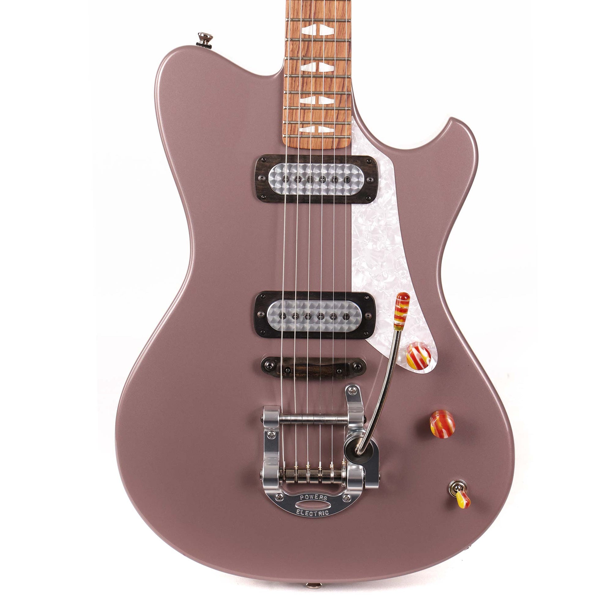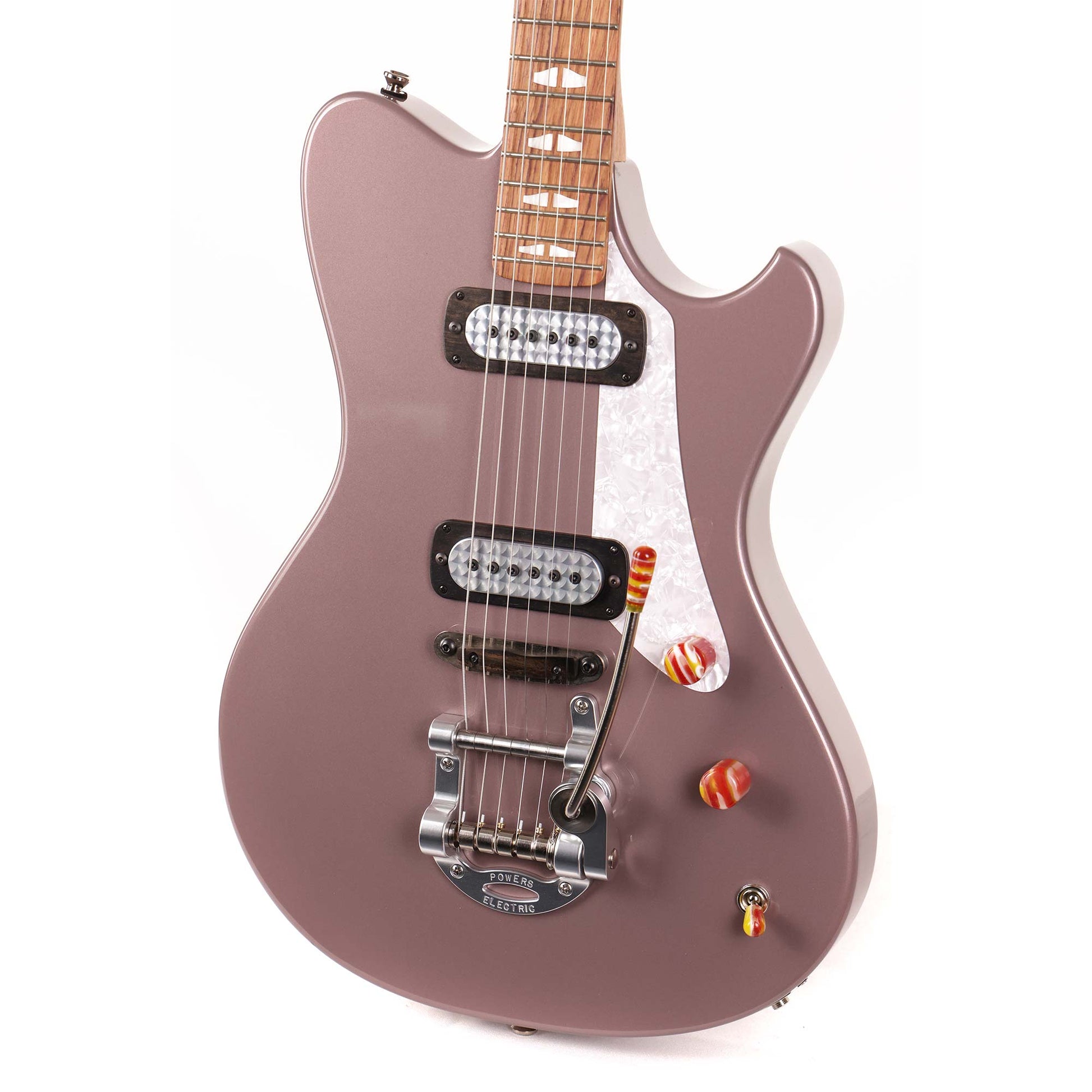 With the exception of the tuners, all of the hardware is made in house at Powers Electric. The tailpiece is a vibrato unit with a special camshaft that's designed to bend the notes in pitch unison just like you'd find on a lap or pedal steel guitar. The knobs and tremolo arm tip are handmade of colorful resin and inspired by the excess material when glassing a surfboard, or if you're old enough to remember - "Fordite", which was the excess paint that came from hand-spraying cars in the 1950s.