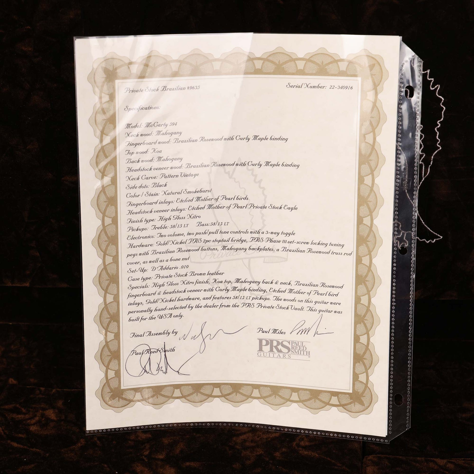 Here's a guitar that shows off what the PRS Private Stock division does best! This is a pre-owned 2022 Private Stock McCarty 594 with a very unique koa top bookmatched to show off the unique grain patterns of the wood and finished in a gloss nitro Natural Smokeburst color. The guitar also features a Brazilian rosewood fretboard and headstock veneer with matching tuner buttons and the truss rod cover. The body is outlined in curly maple binding and the neck is carved to a Pattern Vintage neck profile. There's little to no playwear on this guitar, it's incredibly clean and includes the original hardshell case and PRS certificate of authenticity.