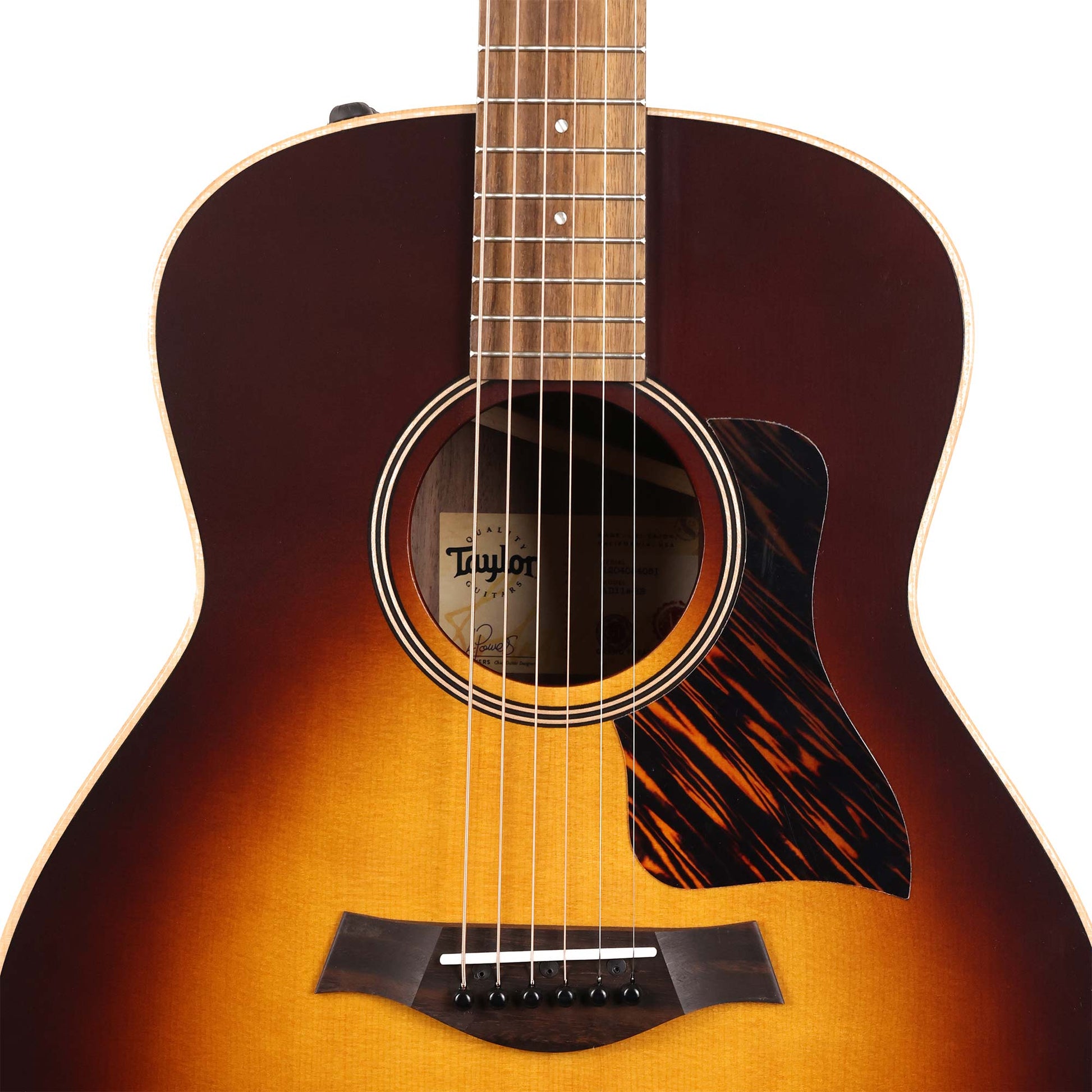 This is the Taylor American Dream AD11e-SB! The model features a solid spruce top with solid walnut for the back and sides all tied together with V-Class bracing. Players are sure to appreciate this guitar’s bold midrange character, which offers remarkable note-to-note definition that makes it a perfect choice for fingerstyle players and flatpickers, especially in recording applications. Along with the alluring hand-sprayed sunburst top color treatment, this model is detailed with chamfered edges for additional playing comfort, black top purfling, a black/maple/black rosette, 4mm dot fretboard inlays in Italian acrylic, satin black tuners, a firestripe faux tortoiseshell pickguard and a matte finish.