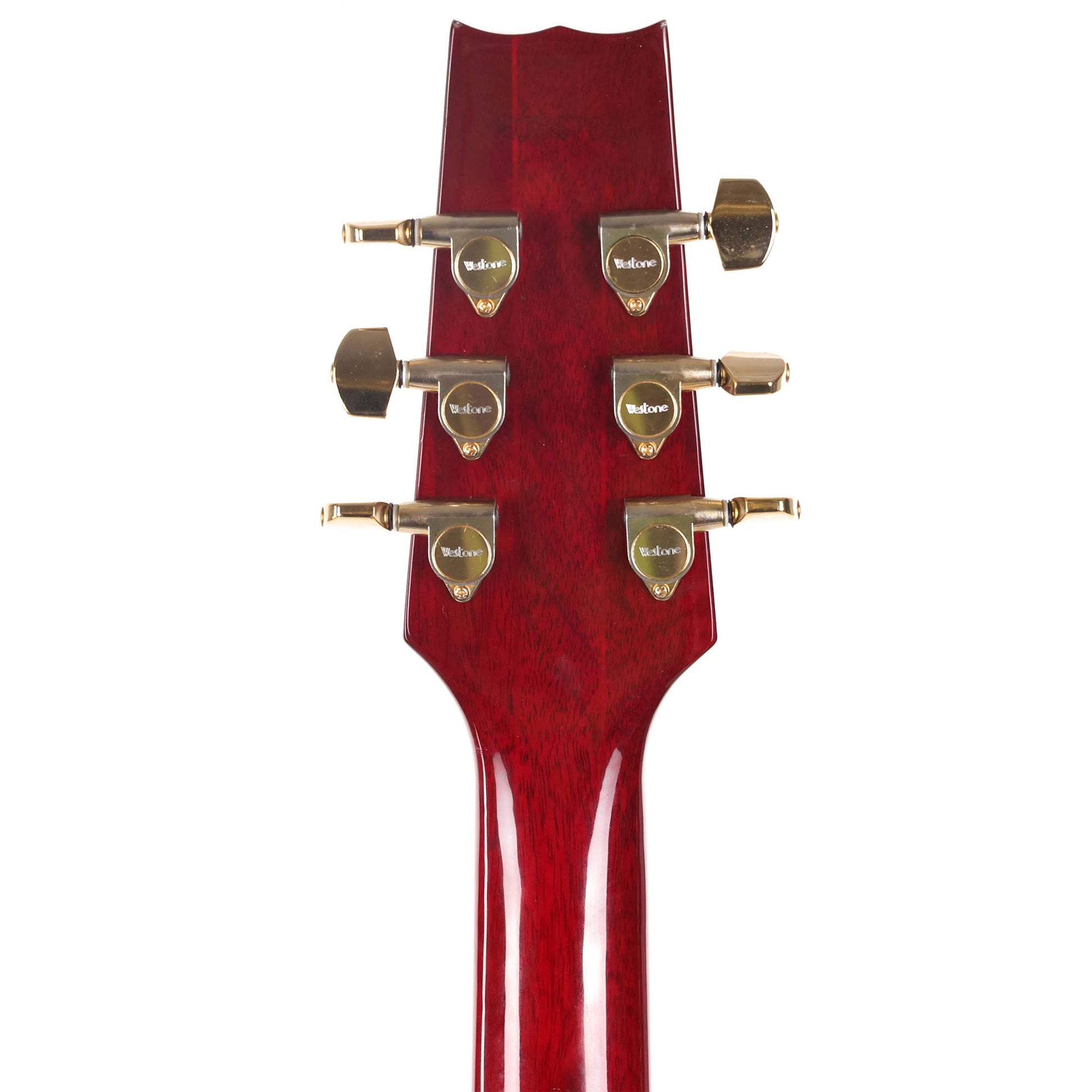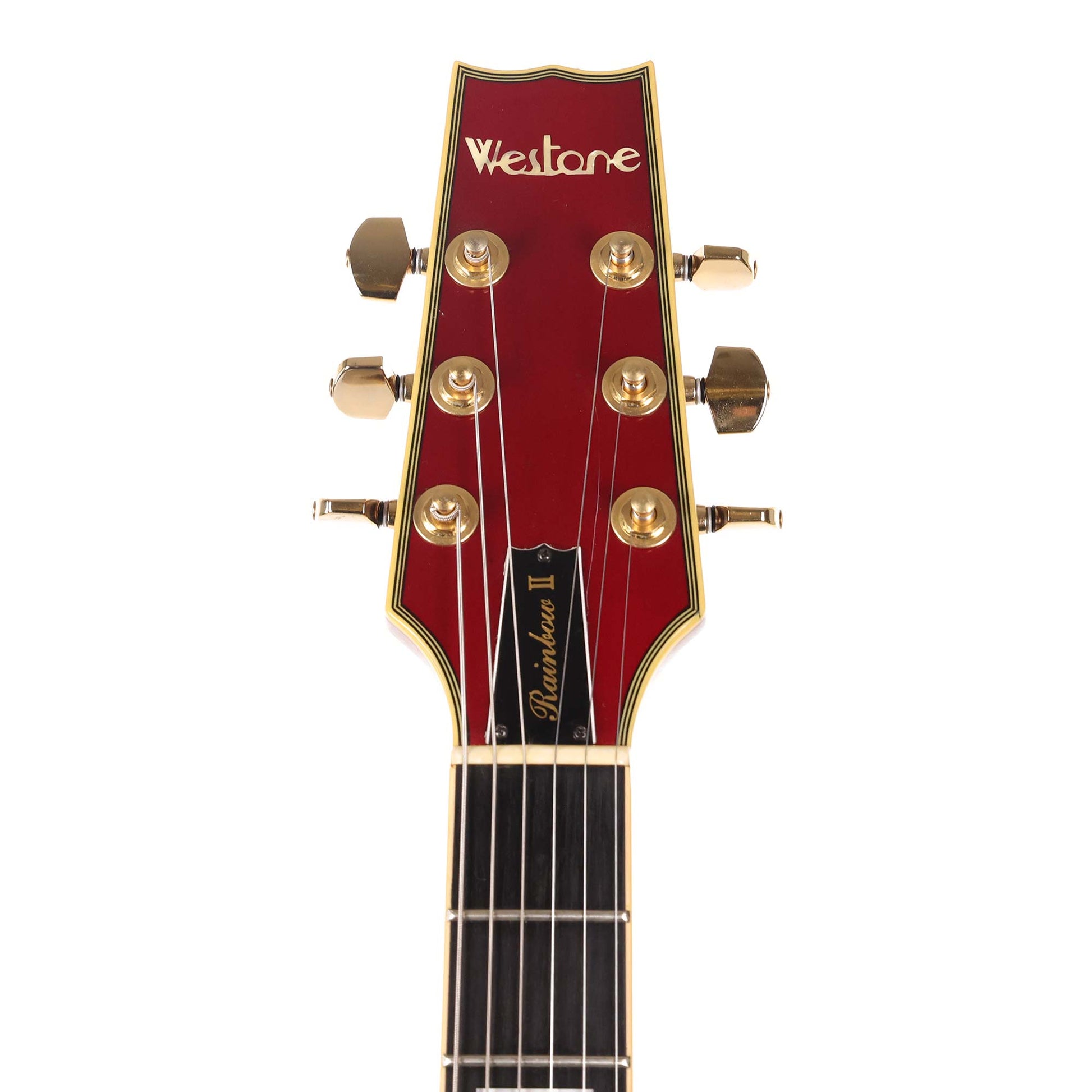 An affordable semi-hollowbody built in Japan, this is a Westone Rainbow II model with a cherry finish over a laminate maple body that has some nice birdseye figuring to it. The guitar was built in Japan and features an adjustable fixeed bridge, two humbucking pickups and gold hardware. It is in overall good to very good shape with wear throughout the body including small dings and scratches. The original case is included.