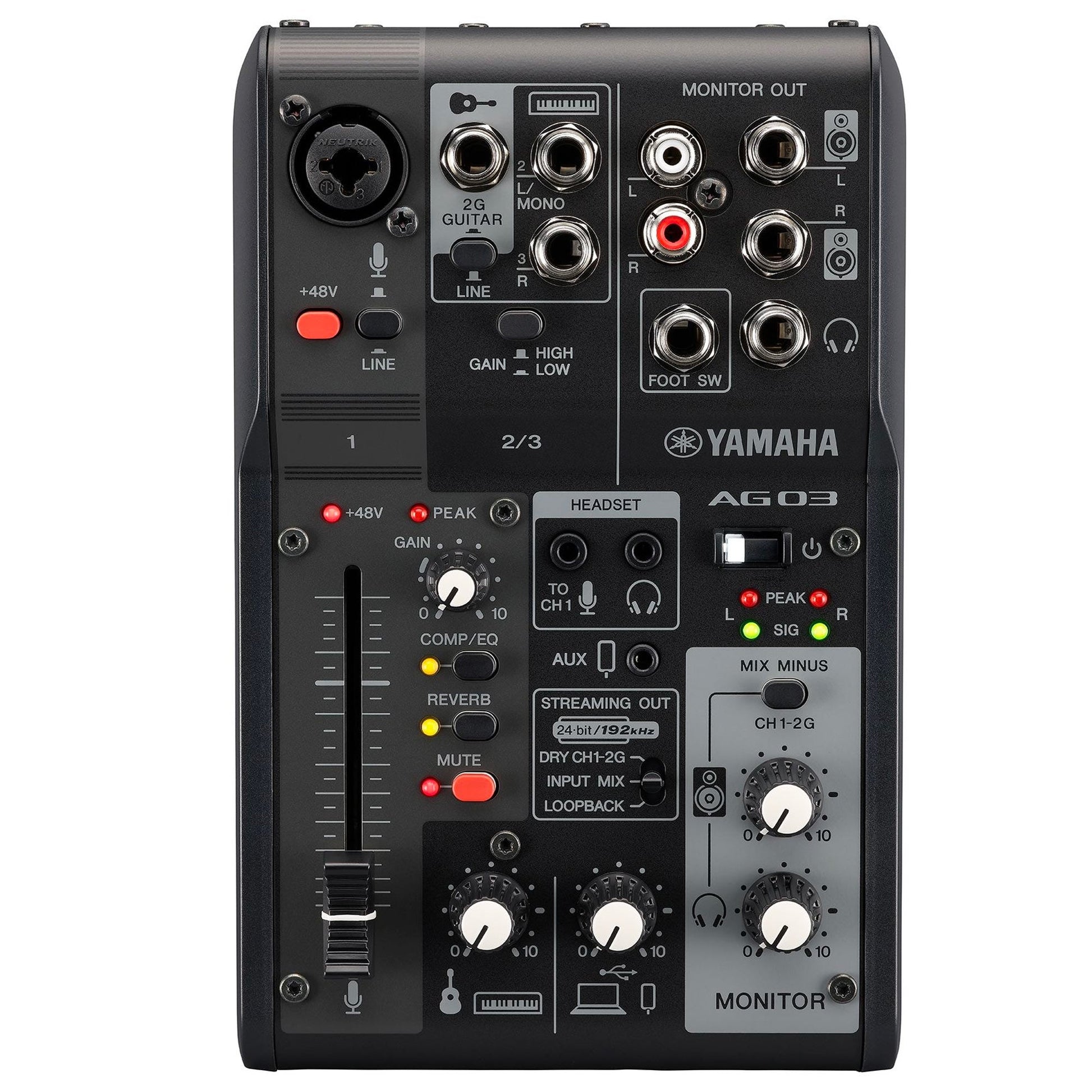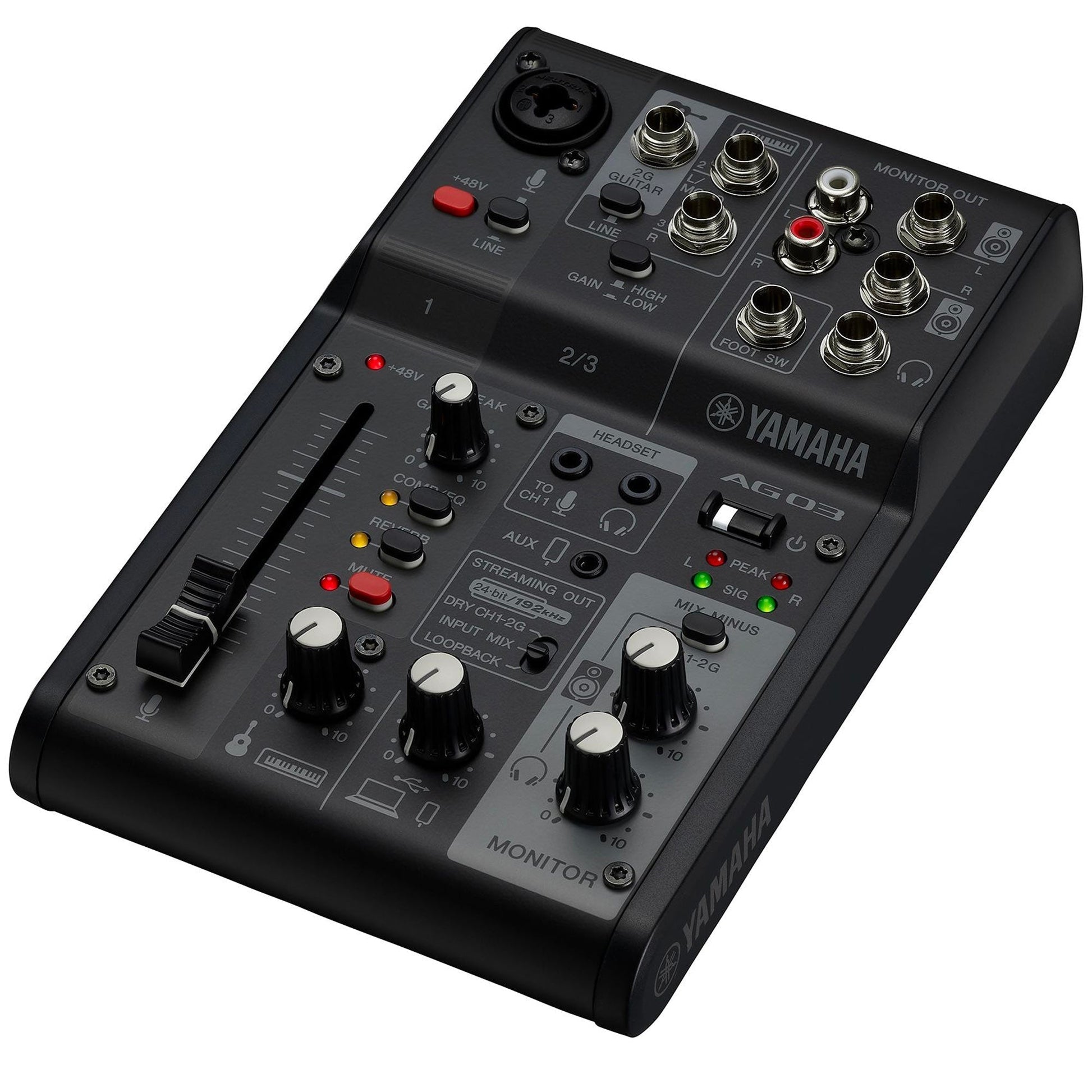 The AG03MK2 features a large 60mm fader that helps you shape and manage audio quickly and efficiently, with a newly added mute button to cut your signal at a quick notice. Reverb and Mute can even be controlled by the optional FC5 foot switch, freeing up your hands for other tasks.