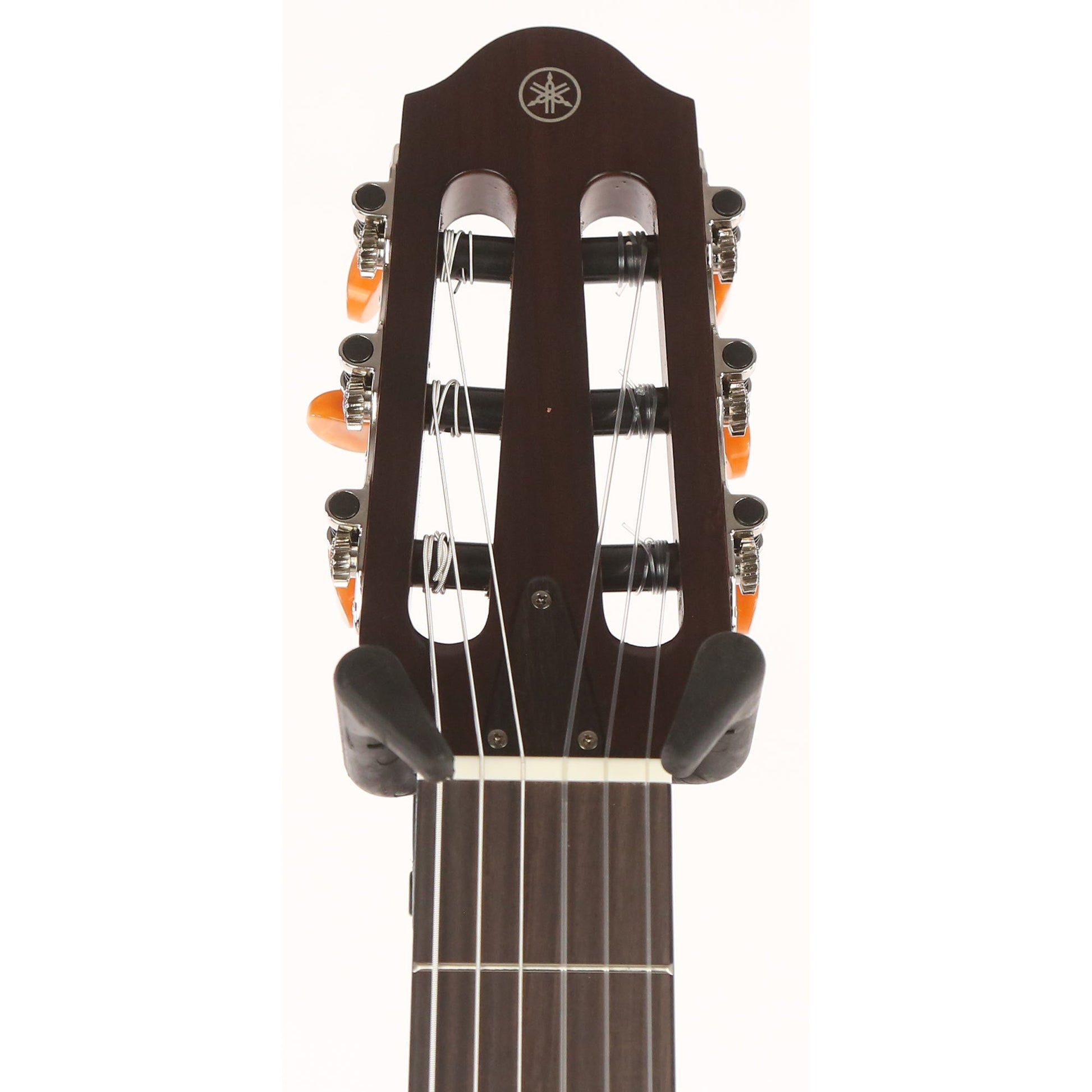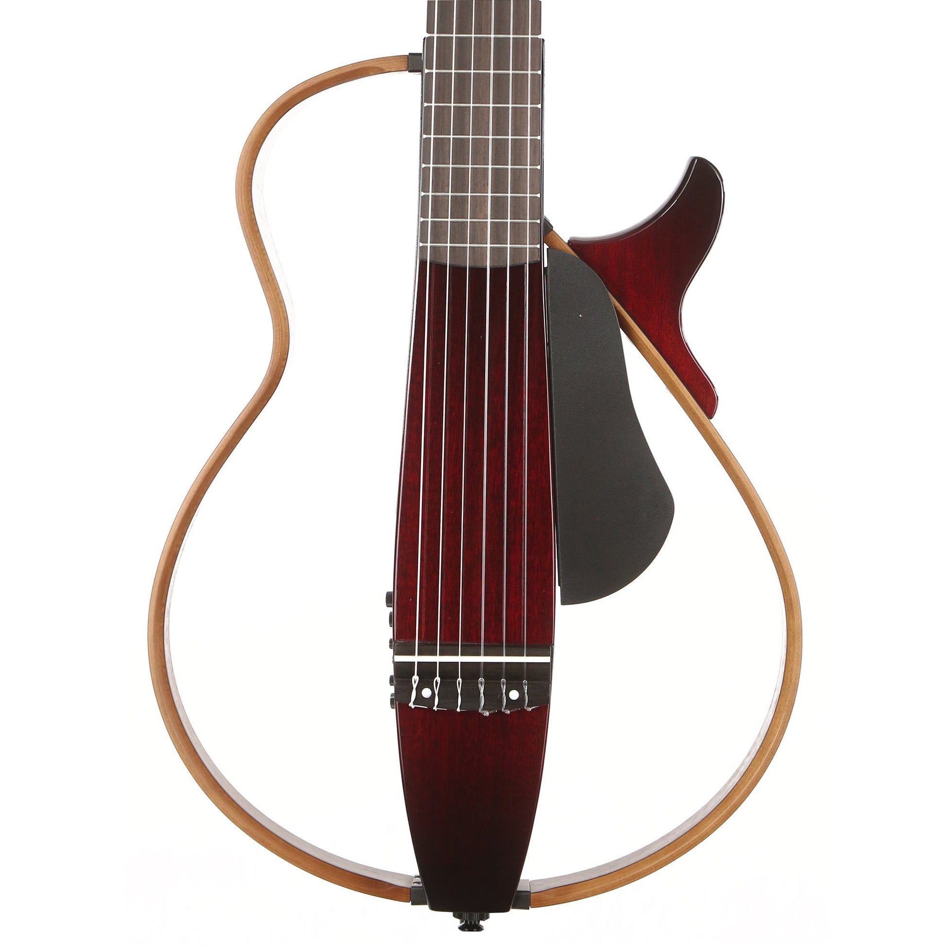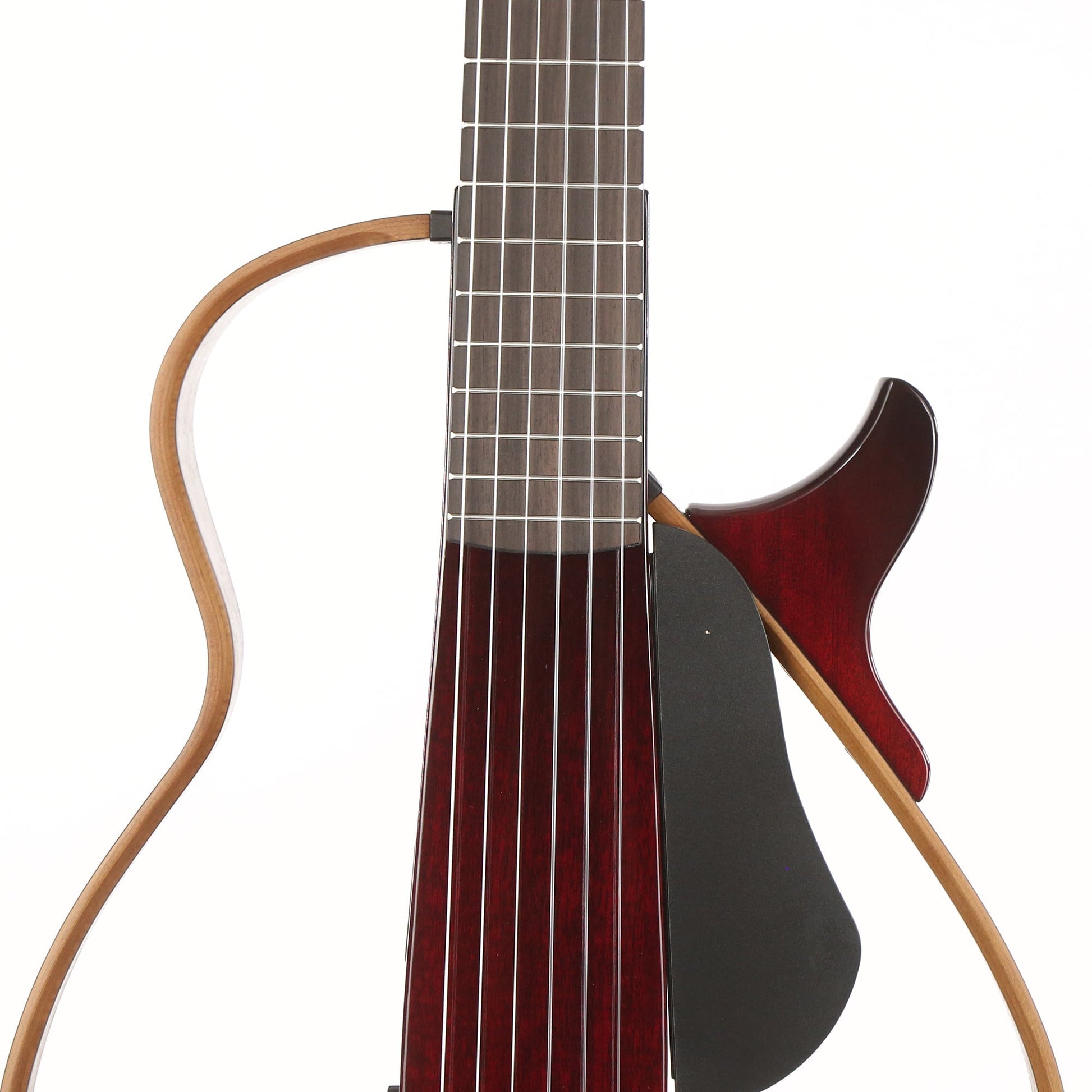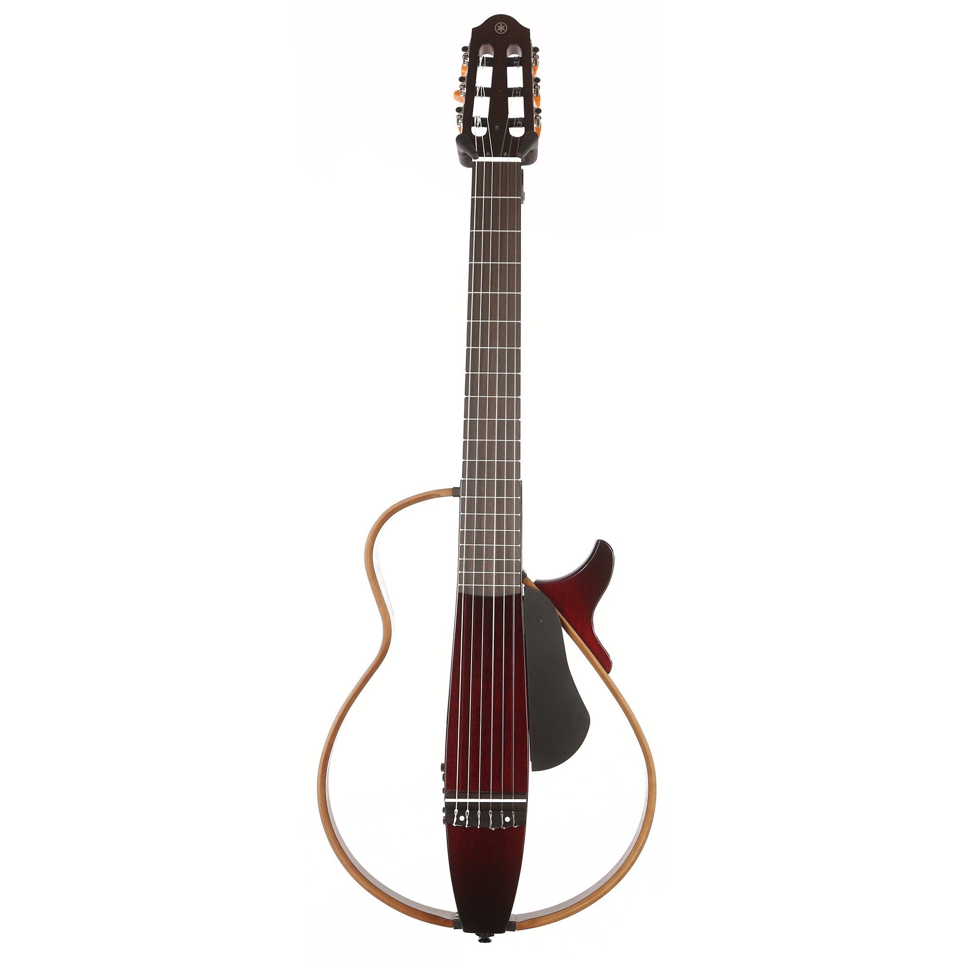 The Yamaha SLG200N Silent Guitar in a Nylon string incarnation with Crimson Red Burst finish continues the tradition of one of the most recognizable "practice guitars" on the market! This SLG200N is compact and collapsible, with near-silent acoustic performance. Or, plug in a pair of your favorite headphones and you'll hear authentic acoustic tones without bothering anyone. You even get a basic set of built-in studio quality effects. The body center piece is made from mahogany, and surrounded by a rosewood and maple frame. The mahogany neck is topped with a rosewood fingerboard and chrome tuners. The electronics are powered by the SRT pickup system.